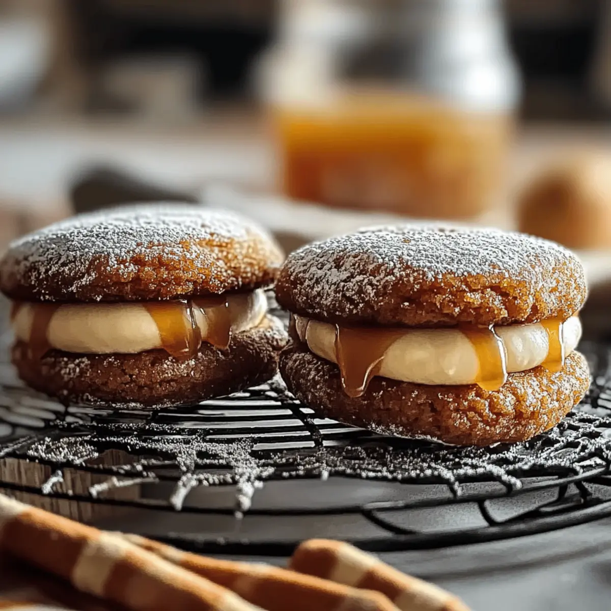 Jump to Recipe Print RecipeAs the first leaves begin to carpet the ground with shades of red and gold, my thoughts drift to cozy gatherings and warm aromas wafting through the kitchen. One of my absolute favorites that captures this spirit is Apple Cider Whoopie Pie Cookies with Caramel. These delightful cookies meld the comforting flavors of apple cider and warm spices with the gooey decadence of homemade caramel filling. They’re not just easy to whip up—they’re also the ultimate crowd-pleaser, perfect for sharing during crisp autumn gatherings or enjoying with a hot cup of cider on a quiet afternoon. Ready to step into fall with this scrumptious treat? Let’s dive in! Why Are These Cookies a Must-Try? Irresistible Flavor: The combination of sweet apple cider and warm spices creates a taste sensation that perfectly embodies the essence of fall. Decadent Caramel Filling: Each whoopie pie is generously filled with creamy caramel, adding a delightful richness that will leave everyone wanting more. Simple to Make: With straightforward steps, even novice bakers can achieve bakery-quality results in no time. Perfect for Sharing: Whether it’s a cozy night in or a lively gathering, these cookies are sure to impress your friends and family—just like my Pistachio Cream Cookies or Mississippi Mud Pie. Versatile Delight: Feel free to experiment with different nuts or flavored extracts, making this recipe as unique as you are! Fall Spirit: These Apple Cider Whoopie Pie Cookies are not just treats—they’re a celebration of autumn flavors that bring warm memories to life. Apple Cider Whoopie Pie Cookies Ingredients Get ready to whip up some delightful fall treats! For the Cookies All-Purpose Flour – Essential for structure; swap with a gluten-free blend if needed. Baking Soda – Acts as a leavening agent; always check for freshness to ensure a perfect rise. Ground Cinnamon – Adds that warm, familiar flavor; consider pumpkin pie spice for a fun twist. Ground Nutmeg – Complements the cinnamon beautifully; freshly grated nutmeg elevates flavor complexity. Salt – Balances sweetness perfectly; sea salt can add a unique flavor profile. Unsalted Butter – Provides moisture and richness; coconut oil works for a dairy-free option. Brown Sugar – Contributes sweetness and moisture; choose light or dark brown sugar based on your preference. Large Eggs – Bind the ingredients; for a vegan version, swap with flax eggs (1 tbsp flaxseed meal + 2.5 tbsp water per egg). Apple Cider – Infuses the cookies with fall flavor and moisture; apple juice can be used in a pinch, but it will alter the taste. Vanilla Extract – Enhances flavor; use pure vanilla extract for the best results. For the Caramel Filling Unsalted Butter – Adds richness to the filling. Brown Sugar – Provides sweetness that complements the cookies beautifully. Heavy Cream – Ensures creaminess for a smooth texture. Vanilla Extract – Boosts overall flavor; opt for pure for the best taste. Note: Store-bought caramel sauce can be a convenient alternative that works well in this recipe. Step‑by‑Step Instructions for Apple Cider Whoopie Pie Cookies with Caramel Step 1: Preheat the Oven Begin by preheating your oven to 350°F (175°C), ensuring it’s ready for baking your Apple Cider Whoopie Pie Cookies. This temperature is crucial for achieving even baking, resulting in perfectly soft and fluffy cookies. As the oven warms up, gather your baking sheets and line them with parchment paper, making the assembly process smoother. Step 2: Prepare the Dry Ingredients In a medium mixing bowl, whisk together the all-purpose flour, baking soda, ground cinnamon, ground nutmeg, and salt. This combination of dry ingredients will give your cookies structure and a warm, spiced flavor profile. Make sure there are no lumps, and once blended, set the bowl aside as you move on to the wet ingredients. Step 3: Cream Butter and Sugar In a large mixing bowl, use an electric mixer to beat the softened unsalted butter and brown sugar together until the mixture is light and fluffy—around 3 to 5 minutes. This process incorporates air into the butter, helping your Apple Cider Whoopie Pie Cookies achieve that dreamy texture. Once creamy, you’re ready to introduce the wet elements. Step 4: Add Eggs and Cider Crack in the large eggs, then pour in the apple cider and vanilla extract. Continue mixing until the batter is smooth and well combined, ensuring that every ingredient is evenly distributed. The apple cider will add delightful moisture and flavor to your cookies, making them irresistible. Step 5: Combine the Mixtures Gradually add your dry ingredient mixture to the wet ingredients, folding it in gently until just combined. Be careful not to overmix, as this can lead to dense cookies. You want to maintain a light and airy batter for your Apple Cider Whoopie Pie Cookies. Step 6: Scoop the Dough Using a cookie scoop or two spoons, drop rounded balls of dough onto the prepared baking sheets, leaving at least 2 inches between each ball to allow for spreading during baking. The dough should be fluffy and sticky, and it’ll yield nice, rounded shapes once baked. Step 7: Bake the Cookies Place the baking sheets in the preheated oven and bake for 12 to 15 minutes, or until the edges are lightly golden while the centers may still appear slightly soft. Keep an eye on them towards the end to prevent overbaking. Once done, remove the sheets and let them cool on a wire rack. Step 8: Make Caramel Filling In a medium saucepan over medium heat, melt the unsalted butter. Stir in the brown sugar and heavy cream, allowing the mixture to come to a gentle boil. Continue cooking for about 3 to 5 minutes, stirring frequently, until the caramel thickens. Remove from heat and mix in vanilla extract for an extra touch of flavor. Step 9: Assemble the Cookies Once the cookies have completely cooled, it’s time to assemble your Apple Cider Whoopie Pie Cookies. Spread a 