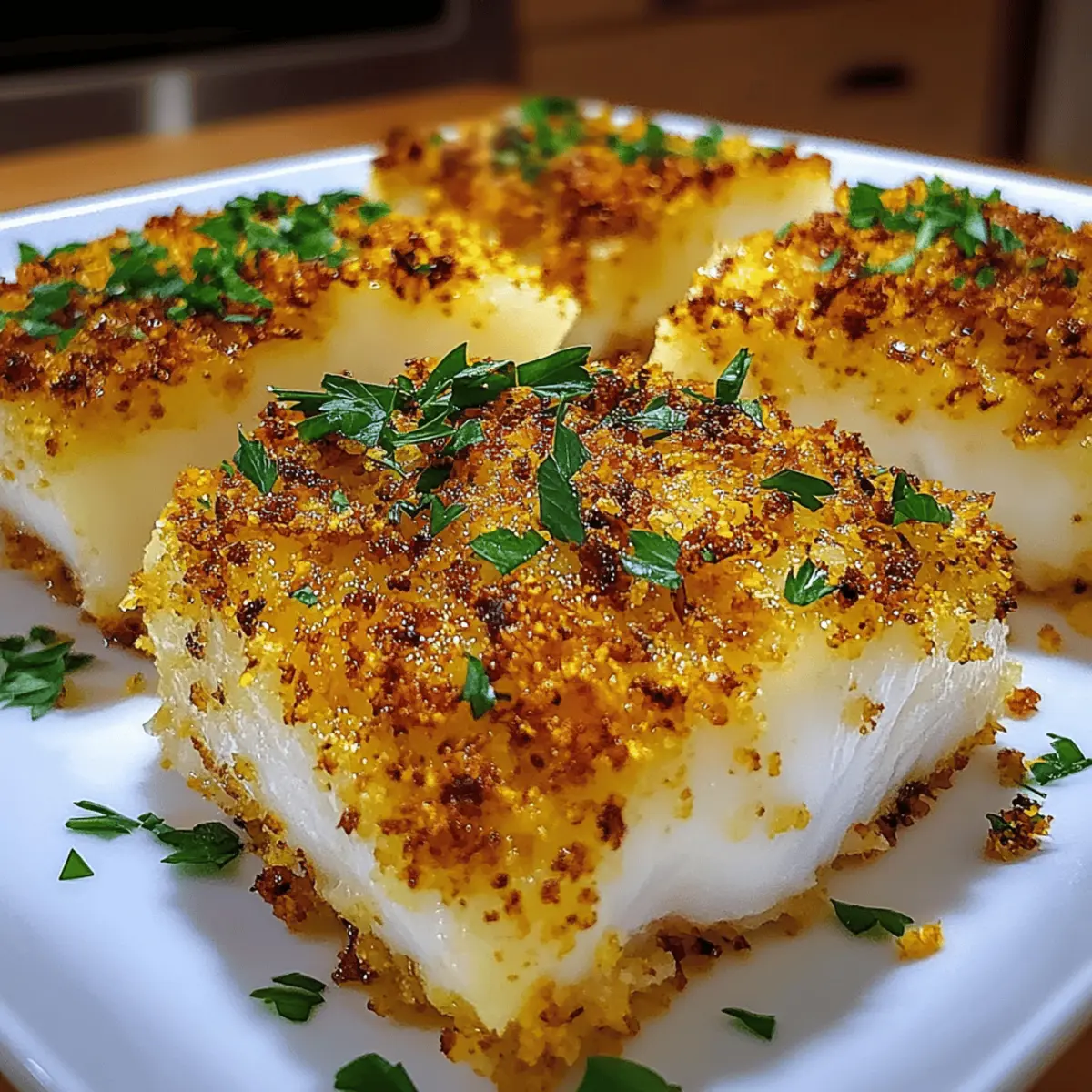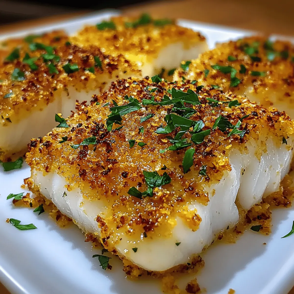 Jump to Recipe Print RecipeAs I was pulling up my memories of cozy family dinners, a delightful dish always stood out: Boston Baked Cod. This recipe takes tender, flaky cod and elevates it with a crispy panko topping, creating an experience that warms both heart and soul without guilt. What I love most about this Easy Boston Baked Cod is how effortlessly it comes together—just 10 minutes of prep and 15 minutes in the oven, making it perfect for my busy weeknights. It’s not just a quick meal; it’s also a low-fat option that doesn’t skimp on flavor! With a satisfying crunch and the freshness of lemon zest, it transforms a simple ingredient into a standout dish that my family always looks forward to. Ready to create a dinner that feels like a hug on a plate? Let’s dive in! Why Choose Boston Baked Cod? Simplicity: This delicious recipe comes together in just 25 minutes, making it ideal for busy weeknights. Guilt-Free Indulgence: With its low-fat profile, you can enjoy a comforting meal without compromising your healthy lifestyle. Crispy Magic: The panko topping adds a delightful crunch that elevates the tender cod, making each bite unforgettable. Flexible Pairing Options: Serve it with roasted vegetables or a light salad for a complete and nutritious meal. Check out our Baked Garlic Parmesan Sweet Potato Wedges for a perfect side! Family Favorite: This dish is a surefire hit with both kids and adults, bringing everyone together for memorable dinners. Cultural Heritage: Enjoy a taste of New England right in your home, with a dish that embodies the essence of comfort food. Boston Baked Cod Ingredients For the Fish Cod Fillets – Fresh is preferred for taste, but frozen can work if properly thawed. For the Topping Butter – Adds richness; substitute with olive oil for a dairy-free option. Panko Breadcrumbs – Creates a light, crispy crust; regular breadcrumbs will yield a denser texture. Parsley – Provides freshness and color; dried herbs like thyme can be a suitable alternative. Garlic Powder – Enhances flavor depth; fresh minced garlic can give a stronger taste. Lemon Zest – Brightens the dish; lime zest can be used if lemon is unavailable. For Seasoning Salt – Essential for enhancing flavor; adjust to your preference. Pepper – Complements the dish; freshly cracked adds even better flavor. This list will ensure your Boston Baked Cod comes out perfectly every time! Step‑by‑Step Instructions for Boston Baked Cod Step 1: Preheat the Oven Begin by preheating your oven to 400°F (200°C) to ensure an even bake for your Boston Baked Cod. This crucial step sets the stage for the perfect crispy topping. While the oven heats up, gather your baking dish and ingredients, so everything is handy for a smooth cooking process. Step 2: Prepare the Baking Dish Take a 9×13 inch baking dish and generously butter it to prevent the cod from sticking during cooking. This adds flavor and helps achieve a beautiful golden crust. Set the buttered dish aside while you prepare the cod, giving it a moment to settle. Step 3: Season the Cod Carefully pat the cod fillets dry with paper towels, ensuring they are moisture-free for optimal crispiness. Season both sides with salt and freshly cracked pepper, adding flavor that elevates the dish. Lay the seasoned fillets flat into the buttered baking dish, leaving space between them for even cooking. Step 4: Make the Topping In a medium saucepan over medium heat, melt the butter until bubbly. Stir in the panko breadcrumbs, finely chopped parsley, garlic powder, and lemon zest. Mix thoroughly until the panko is well-coated and all ingredients are evenly combined, creating a delightful topping that will contrast beautifully with the tender cod. Step 5: Assemble the Dish Evenly distribute the panko mixture over the cod fillets, gently pressing down to form a cohesive layer. This crispy topping is the star of your Boston Baked Cod. Once the topping is in place, this dish is almost ready for the oven—just a couple of finishing touches left! Step 6: Drizzle with Flavor For an extra layer of flavor, drizzle a little olive oil and fresh lemon juice over the top of the cod and panko topping. This will not only enhance the taste but also assist in achieving that coveted golden brown color as it bakes in the oven. Step 7: Bake to Perfection Carefully place the baking dish in the preheated oven and bake for 12 to 15 minutes. Keep an eye on your Boston Baked Cod, watching for the topping to turn a lovely golden brown and the fish to flake easily with a fork. Ensure the internal temperature reaches 145°F for perfectly cooked cod. Step 8: Serve and Enjoy Once baked, remove the dish from the oven and let it sit for a couple of minutes. This will allow the topping to set slightly. Then, serve your Boston Baked Cod hot, paired with your favorite sides. Enjoy the delightful crunch and tender fish that make this dish a family favorite! Make Ahead Options These Easy Boston Baked Cod fillets are perfect for meal prep enthusiasts! You can prepare the panko topping and store it in an airtight container in the refrigerator for up to 3 days, which saves precious time on busy weeknights. Additionally, the cod fillets can be seasoned and placed in the baking dish up to 24 hours in advance, but make sure to pat them dry and cover the dish with plastic wrap to maintain their freshness and prevent browning. When you’re ready to bake, simply preheat the oven and layer the panko topping over the cod before baking as directed. This way, you’ll enjoy delicious, hassle-free dinners that are just as delightful as if you’d made them from scratch on the spot! Boston Baked Cod Variations Feel free to get creative with this dish and make it your own! Gluten-Free: Replace panko with crushed cornflakes or almond flour for a crispy, gluten-free crust. This twist still provides a satisfying crunch without the gluten. Extra Flavor: Sprinkle in a teaspoon of paprika or cayenne pepper to th