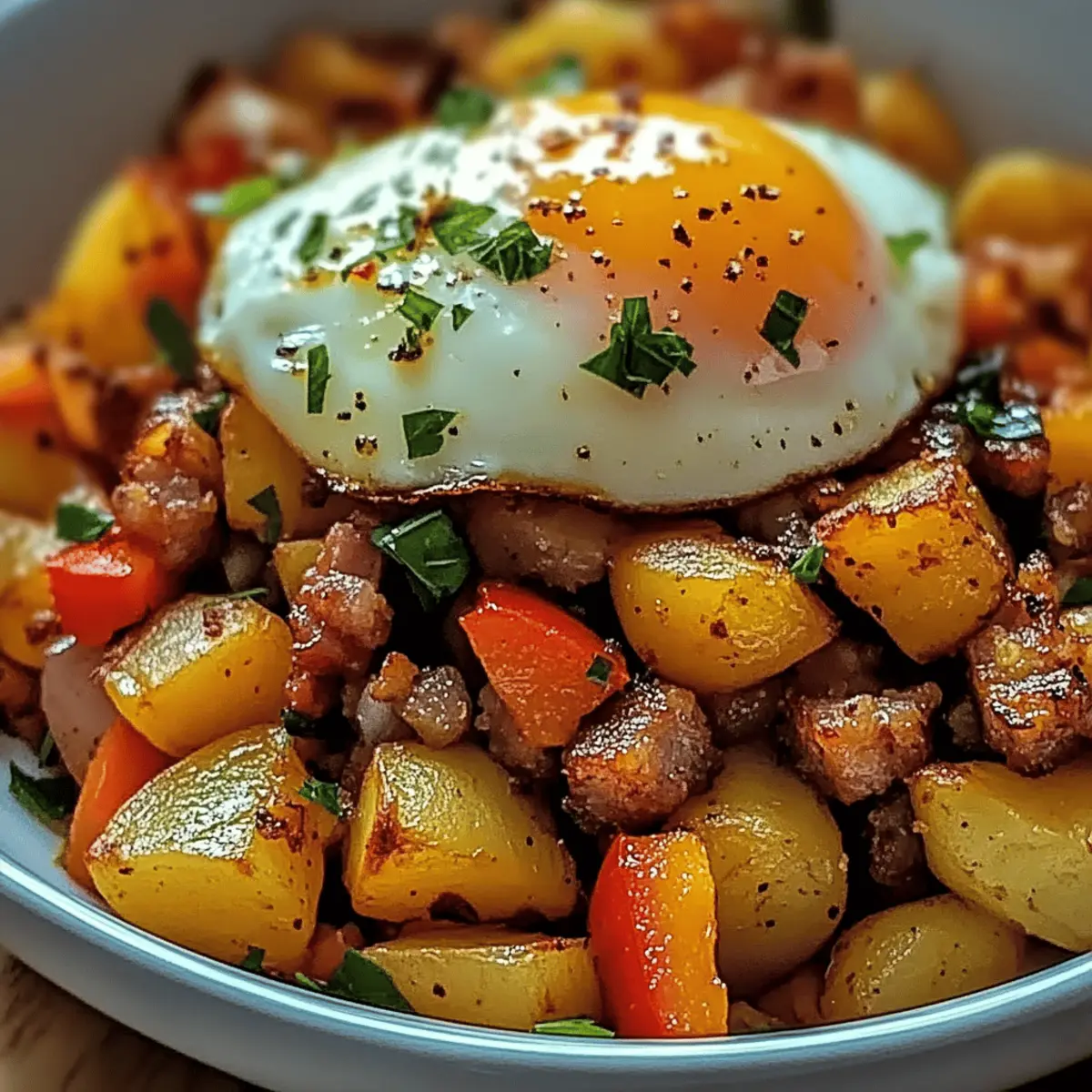Jump to Recipe Print RecipeIn the early morning light, the sound of sizzling potatoes fills the kitchen, waking up my senses and setting the stage for a delightful day ahead. This Loaded Breakfast Hash has quickly become a staple in my home, not just for its vibrant mix of potatoes, savory meats, and colorful veggies, but also for its incredible versatility. Whether it’s a lazy weekend brunch or a quick weeknight meal, this breakfast hash offers a satisfying way to use leftovers while also being adaptable to suit vegetarian cravings. You can cook up a hearty portion in under 30 minutes, making it the perfect solution for anyone tired of fast food. What will you toss into your breakfast hash today? Why Will You Love This Breakfast Hash? Versatility: This Loaded Breakfast Hash adapts to your taste buds—swap out meats or add extra veggies, making meal prep both exciting and efficient. Quick & Easy: In under 30 minutes, you’ll have a hearty breakfast that’s ready to satisfy your cravings without ordering takeout. Flavor Explosion: The combination of crispy potatoes, savory sausage, and fresh herbs creates a delightful symphony of flavors, ensuring each bite is bursting with deliciousness. Minimal Waste: Ideal for using up leftovers—you can load it with whatever you have on hand, making this not just a breakfast but a waste-busting hero! Family-Friendly: Everyone at the table will love it, whether they prefer classic ingredients or a trendy twist like sweet potatoes or plant-based alternatives. You might also enjoy other versatile options like Savory Breakfast Protein or Benedict Casserole Breakfast for a well-rounded morning feast! Breakfast Hash Ingredients Discover the delightful components that make this Breakfast Hash a mouthwatering experience! For the Potatoes • Potatoes (2 lbs, Yukon Gold or Russet, diced) – The heart of the dish, they provide a deliciously hearty base; feel free to substitute sweet potatoes for a touch of sweetness. For the Meats • Cooked Sausage (1 lb, breakfast sausage or chorizo, crumbled) – Delivers rich flavor and protein; using pre-cooked options can save you time. • Bacon (8 strips, cooked and crumbled) – Adds a crispy richness; turkey bacon is a healthier alternative if desired. For the Veggies • Onion (1 large, diced) – Adds a depth of flavor; shallots are a milder substitute if preferred. • Bell Peppers (2, any color, diced) – Brings sweetness and vibrant color; swap them out for zucchini or any veggies you have on hand. • Garlic (2 cloves, minced) – Elevates the aroma; garlic powder is a handy substitute in a pinch. For the Eggs • Eggs (6-8, large) – Provide protein and richness; skip them for a vegan version and try crumbled tofu instead. For the Cheese • Cheese (1 cup, shredded cheddar, Monterey Jack, or pepper jack) – Adds creaminess; swap for nutritional yeast to make it vegan-friendly. For Cooking • Olive Oil (3 tablespoons) – Ideal for sautéing, but feel free to use butter or avocado oil for a flavor twist. For Seasoning • Seasonings (Salt, Black Pepper, Paprika, Onion Powder, Garlic Powder, to taste) – Essential for enhancing flavor; adjust to your liking for the perfect balance. For Garnishing • Fresh Herbs (Optional, chopped parsley, chives, or cilantro) – Offers a burst of freshness; any herbs you have on hand will brighten your dish! Step‑by‑Step Instructions for Loaded Breakfast Hash Step 1: Prepare the Potatoes Begin by dicing 2 pounds of Yukon Gold or Russet potatoes into even cubes, ensuring they cook uniformly. If you’d like extra crispiness, soak the diced potatoes in cold water for about 20 minutes, then drain and pat them dry thoroughly with a towel. Step 2: Cook the Bacon If using raw bacon, heat a skillet over medium heat, adding 8 strips. Cook until crispy, about 8-10 minutes, turning occasionally to avoid burning. Once done, transfer the bacon to a paper towel-lined plate to cool before crumbling into bite-sized pieces. Step 3: Sauté Onions and Peppers In the same skillet, add 3 tablespoons of olive oil and heat over medium heat. Toss in one large diced onion and two diced bell peppers, cooking until they become tender and slightly caramelized, which should take about 5-7 minutes. Stir occasionally for even cooking. Step 4: Add Garlic and Spices Next, stir in 2 minced garlic cloves along with your preferred seasonings, such as salt, black pepper, paprika, onion powder, and garlic powder to taste. Sauté the mixture for an additional 1-2 minutes until fragrant, allowing the flavors to meld beautifully in your Loaded Breakfast Hash. Step 5: Cook the Potatoes Now, add the prepared potatoes to the skillet, ensuring they’re evenly distributed. Cook for approximately 10-15 minutes, stirring occasionally, until the potatoes are golden brown and tender. A slight crisp on the edges signals they’re nearly ready. Step 6: Incorporate Cooked Sausage and Bacon Once the potatoes are cooked, fold in 1 pound of crumbled cooked sausage and the crumbled bacon from earlier. Mix everything gently, allowing the flavors to combine and warm through for about 3-4 more minutes, ensuring every bite of the breakfast hash is packed with deliciousness. Step 7: Add Cheese (Optional) If you desire a cheesy finish to your Loaded Breakfast Hash, sprinkle about 1 cup of shredded cheese over the mixture. Cover the skillet with a lid for 2-3 minutes until the cheese melts, creating a creamy, inviting layer atop the hearty ingredients. Step 8: Cook the Eggs (Optional) For added protein, create wells in the hash and crack 6-8 large eggs into them. Cover the skillet again and cook for about 5-7 minutes, monitoring until the eggs are set to your liking. This step transforms your breakfast hash into a complete and satisfying meal. Step 9: Serve and Garnish Finally, portion the Loaded Breakfast Hash onto serving plates. Garnish with freshly chopped herbs like parsley, chives, or cilantro for a burst of color an