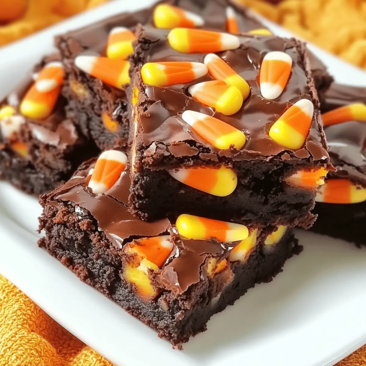 Jump to Recipe Print RecipeAs Halloween approaches, I find myself daydreaming about the vibrant colors and sweet treats that fill the air with joy. One creation that perfectly captures this festive spirit is my Candy Corn Brownies, a delicious confection that will swiftly become the highlight of your autumn gatherings. These brownies combine rich, fudgy chocolate with chewy pockets of candy corn, creating a visually stunning dessert that’s both fun and satisfying. The best part? They’re incredibly quick to whip up—ideal for last-minute festivities! Whether you’re planning a Halloween party or simply craving a cozy treat at home, these Candy Corn Brownies will delight your taste buds and impress your guests. Curious to see how easy it is to make this seasonal delight? Let’s dive into the recipe! Why Make Candy Corn Brownies? Irresistible combination: These Candy Corn Brownies blend fudgy chocolate goodness with colorful candy corn, resulting in a feast for the eyes and the palate. Festive flair: Perfect for Halloween celebrations, they instantly elevate any dessert spread to a new level of fun, making them a crowd favorite! Super easy: With minimal prep and cook time, even novice bakers can impress their loved ones without breaking a sweat. Versatile twists: Feeling creative? Swap out the candy corn for seasonal sprinkles or chocolate chips! You can also check out our Honey Butter Cornbread for another delicious autumn treat. Family-approved: Whether served at parties or cozy gatherings, these brownies are sure to bring smiles and sweet memories. Candy Corn Brownie Ingredients • Get ready to bake! Here’s everything you need to whip up your Candy Corn Brownies. For the Brownies Unsalted Butter – Adds richness and moisture; you can substitute with margarine or a vegan butter alternative if needed. Unsweetened Cocoa Powder – Essential for chocolate flavor; ensure it’s unsweetened for balanced sweetness. Granulated Sugar – Sweetens the brownies for that fudgy texture; brown sugar can be used for a deeper flavor. Large Eggs – Binds all the ingredients together; for a vegan option, use flax eggs instead. All-Purpose Flour – Gives structure to the brownies; swap with a gluten-free blend for a gluten-free version. Chopped Walnuts (optional) – Introduces a nice crunchy texture; omit for nut allergies or substitute with chocolate chips for extra chocolaty goodness. Chocolate Icing – Adds sweetness and a glossy finish; feel free to use store-bought for ease! Candy Corn Pieces – Brings festive color and sweetness into your brownies; using fresh candy corn will give the best results. Melted Chocolate (for drizzling) – Enhances both decoration and flavor; be sure it’s cooled slightly before applying. For Optional Serving Vanilla Ice Cream – A lovely complement to the rich brownies; adds creaminess and balances sweetness. Hot Chocolate – Pair warm brownies with hot chocolate for a cozy autumn treat. With all your ingredients ready, let’s create a delightful treat that embodies the spirit of the season! Step‑by‑Step Instructions for Candy Corn Brownies Step 1: Preheat the Oven Begin by preheating your oven to 350°F (175°C). While it warms, prepare an 8×8-inch baking pan by greasing it well with butter or non-stick spray. This will ensure your Candy Corn Brownies release easily once baked. Preheating is crucial for achieving that perfect fudgy texture, so let the oven heat up completely before moving on to the next steps. Step 2: Combine Butter and Cocoa In a large mixing bowl, melt the unsalted butter until it’s smooth and slightly cooled. Add the unsweetened cocoa powder and stir vigorously until the mixture is well combined and glossy. This step is essential as it builds the rich chocolate base of your brownies. Once fully mixed, it will have a thick consistency that feels inviting and indulgent. Step 3: Add Sugar and Eggs Next, introduce granulated sugar to the chocolate mixture, stirring until the sugar is fully incorporated. Then, crack in the large eggs one at a time, beating the mixture until it turns smooth and slightly fluffy. This addition helps bind your Candy Corn Brownies together, enriching the flavor and texture. The batter should appear thick and shiny after mixing. Step 4: Mix in Flour and Walnuts Gently fold in the all-purpose flour into the batter, along with the optional chopped walnuts if you’re using them. Mix until just combined; be cautious not to overmix, as you want to maintain the brownies’ fudgy character. When incorporated correctly, the batter will feel dense and rich. If desired, this can also be the stage to fold in chocolate chips for an extra chocolatey kick. Step 5: Transfer to Baking Pan Pour the brownie batter into your prepared baking pan. With a spatula, carefully spread it into an even layer to ensure uniform baking. The batter will be thick but should fill out the pan nicely. This stage is where the magic begins, as the chocolatey goodness will soon take shape in the oven. Step 6: Bake the Brownies Place the pan in the preheated oven and bake for about 20 minutes. You’ll know they’re ready when the top appears set and slightly moist to the touch. A toothpick test can be employed—a few moist crumbs should cling when you pull it out. Avoid overbaking, as that will detract from the delicious fudgy texture of your Candy Corn Brownies. Step 7: Cool and Ice Once done baking, take your brownies out of the oven and let them cool in the pan for about 15 minutes. After cooling, spread a generous layer of chocolate icing evenly on top. The warmth of the brownies will help the icing melt slightly, creating a glossy finish that’s decadent and inviting. Step 8: Add Candy Corn Immediately sprinkle candy corn pieces over the chocolate icing. Doing this while the icing is still soft allows the candy to stick beautifully. The vibrant colors of the candy corn will contrast delightfully with the rich icing, bringing a fes