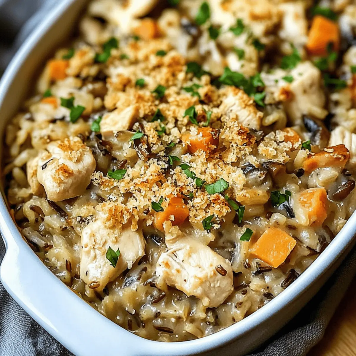Jump to Recipe Print RecipeAs I stood in my cozy kitchen, the scent of savory garlic and sizzling vegetables wrapped around me like a warm hug. This is the kind of atmosphere I cherish when preparing a family favorite: Homemade Chicken Wild Rice Casserole. The beauty of this dish lies not only in its comforting richness but also in its ability to adapt to whatever seasonal vegetables you have on hand. By crafting a creamy, mouthwatering sauce from scratch, you’ll impress your loved ones while keeping it nutritious and wholesome. Whether you’re looking for a quick prep option for busy weeknights or a crowd-pleaser that brings everyone to the table, this casserole checks all the boxes. Ready to start cooking and discover how this recipe can fit into your family traditions? Why is Chicken Wild Rice Casserole Special? Comforting Charm: This casserole embodies the warmth of home-cooked meals, sure to evoke nostalgia and smiles around your dinner table. Customizable Goodness: Easily swap in seasonal veggies or adjust flavors, making this dish your own! Imagine vibrant summer squash or earthy spinach in the mix. Nutritious Meal: Packed with protein and wholesome ingredients, it strikes a perfect balance between indulgence and health, much like Thai Chicken Soup or Salmon Rice Bowls. Saves Time: Prep this meal in advance; it’s perfect for busy weeknights when you crave something hearty yet effortless. Crowd-Pleasing Delight: Whether it’s for family dinner or gathering with friends, the creamy texture and crispy topping make it a sure-fire hit! Chicken Wild Rice Casserole Ingredients For the Casserole • Wild Rice Blend – Provides a nutty flavor and chewy texture; substitute with brown rice for a different base. • Chicken Breasts/Thighs – Offers protein and heartiness; thighs may impart more flavor and moisture. • Salt, Pepper, Paprika – Essential seasonings to enhance the flavor of the casserole. • Olive Oil – Ideal for sautéing ingredients; can substitute with vegetable oil if needed. • Unsalted Butter – Adds richness to the creamy sauce. • Yellow Onion – Serves as the base flavor for the vegetable mix. • Celery – Contributes a nice crunch and aromatic flavor. • Carrots – Adds sweetness and lovely color; you can also use bell pepper as a substitute. • Garlic – Essential for depth of flavor; never skip this! • Baby Bella/Creamy Mushrooms – Adds umami and texture; portobello or shiitake are great alternatives. • Low Sodium Chicken Broth – This savory liquid serves as the base for your sauce to enhance flavor. • Cornstarch – Thickens the sauce for a perfect consistency. • Flour – Key for creating a roux that gives the sauce its richness. • Milk – Brings creaminess; a dairy-free alternative works well too. • Dijon Mustard & Worcestershire Sauce – Infuse the sauce with depth and tang. • Dried Herbs (Parsley, Basil, Thyme) – Infuses flavor; feel free to use fresh herbs for an extra kick. • Cheddar & Parmesan Cheese – Provide creaminess and rich flavor; alternative cheeses can also suffice. • Panko Breadcrumbs – Topping that provides crunchiness; regular breadcrumbs can work as a substitute. Step‑by‑Step Instructions for Chicken Wild Rice Casserole Step 1: Preheat and Prepare Begin by preheating your oven to 350°F (175°C). While the oven warms, lightly spray a 9×13 inch baking dish with cooking spray to prevent sticking. Keep it handy, as this will soon hold your delicious Chicken Wild Rice Casserole, brimming with flavor and warmth. Step 2: Season the Chicken Generously season your chicken pieces with salt, pepper, and paprika. Pat the chicken dry with paper towels to enhance the sear during cooking. This step is essential as it elevates the overall taste of the casserole. Set the seasoned chicken aside while you prepare for the sautéing process. Step 3: Sear the Chicken In a large skillet, heat a tablespoon of olive oil over medium-high heat. Add the seasoned chicken and sear until the pieces are opaque but not fully cooked, about 5–7 minutes. Once done, transfer the chicken to a plate, letting it rest while you continue with the vegetables, capturing all those savory juices. Step 4: Sauté the Vegetables Using the same skillet, add another drizzle of olive oil and toss in diced onion, celery, and carrots. Sauté for about 5–6 minutes until the vegetables are tender and the onion becomes translucent. Stir in minced garlic and cook for an additional 30 seconds, until fragrant, setting the stage for the rich flavors of your Chicken Wild Rice Casserole. Step 5: Cook the Mushrooms Now, reduce the heat to medium and add in sliced mushrooms along with a tablespoon of unsalted butter. Cook until the mushrooms are golden brown, about 4–5 minutes. Stir occasionally to ensure even cooking. Once done, mix the mushrooms with the sautéed vegetables and seared chicken, creating a flavorful medley. Step 6: Make the Sauce In the same skillet, start your sauce by whisking together low sodium chicken broth and cornstarch in a bowl. Then, melt butter in the skillet, adding flour to create a roux. Slowly whisk in the milk, followed by your broth mixture, continuing to stir until the sauce thickens (about 5–7 minutes). Season with Dijon mustard, Worcestershire sauce, and dried herbs for a delightful twist. Step 7: Combine and Transfer Stir in the shredded cheddar and Parmesan cheese into the thickened sauce until melted and smooth. Then, add the sautéed chicken and wild rice to the sauce, ensuring everything is well coated. Transfer this hearty Chicken Wild Rice Casserole mixture into your previously prepared baking dish, leveling it off for even cooking. Step 8: Add the Toppings Sprinkle any remaining cheese over the casserole, followed by a generous layer of panko breadcrumbs for that signature crunch. This crispy topping will contrast beautifully with the creamy filling beneath, adding another layer of texture to your di