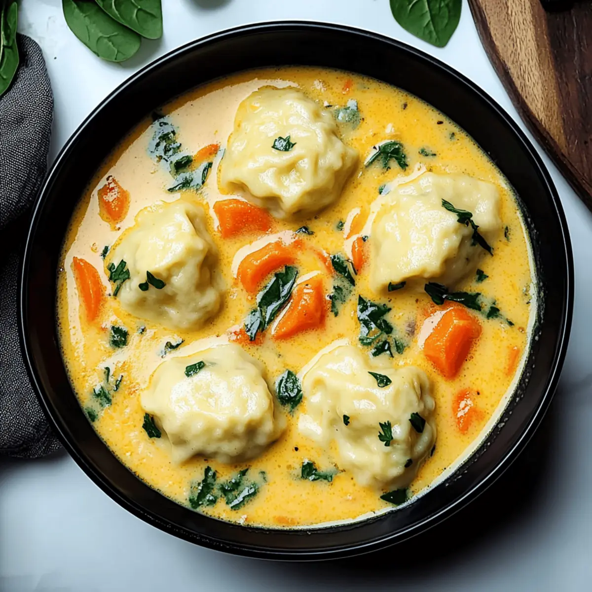 Absolutely! For this Coconut Curry Soup with Dumplings, look for fresh and vibrant vegetables. Carrots should be bright orange and firm, without dark spots. Potatoes should feel heavy for their size and be free of green patches or sprouting. Spinach should have deep green, crisp leaves. Avoid veggies with wrinkled skin or soft spots; go for freshness to ensure the best flavor!