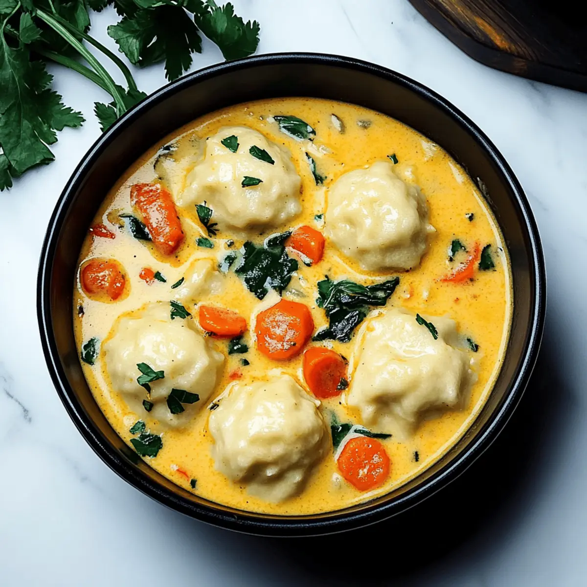 Once the dumplings are cooked through, taste the soup and adjust seasonings if necessary, adding more salt or pepper as you prefer. Ladle the warm Coconut Curry Soup with Dumplings into bowls, garnishing generously with fresh cilantro before serving. Enjoy the creamy warmth that awaits!