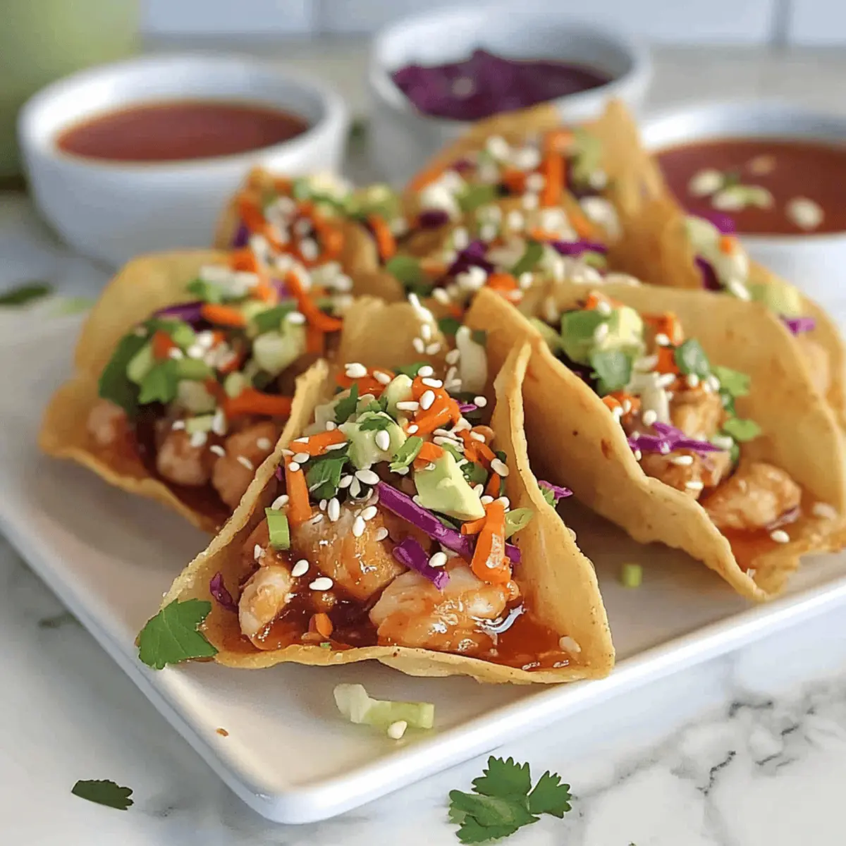 Jump to Recipe Print RecipeAs I unwrapped my first crispy wonton taco, the faint crunch echoed in my kitchen, a sound that promised something extraordinary. These Crispy Chicken Wonton Tacos are not just any appetizer; they’re a delightful twist on a classic that will have every guest asking for the recipe. The combination of juicy honey-garlic marinated chicken, topped with a zesty Asian slaw, creates a burst of flavor within a perfectly crispy wonton shell. These tacos are a crowd-pleaser that come together in no time, making them an ideal choice for game day snacks or casual get-togethers. Plus, they’re family-friendly—a perfect way to switch up taco night! Curious to learn how to elevate your next gathering with this irresistible recipe? Let’s dive in! Why Are These Wontons So Irresistible? Crowd-Pleasing Charm: These Crispy Chicken Wonton Tacos are sure to be the star of any gathering, tempting your guests with their vibrant presentation and delightful crunch. Unique Flavor Fusion: The combination of honey-garlic marinated chicken and zesty Asian slaw creates a surprising explosion of taste that will keep everyone coming back for more. Quick & Easy Prep: With just a few simple steps, you can whip up these tacos in no time, making them perfect for busy weeknights or impromptu parties. Versatile Ingredients: Feel free to customize with your favorite veggies or proteins; the recipe is easily adaptable, so you can make them your own! Family-Friendly Fun: Everyone, from kids to adults, will fall in love with the engaging textures and exciting flavors, making dinner a breeze while keeping everyone satisfied. Don’t miss out on pairing these delicious tacos with some Garlic Butter Chicken Bites for a complete meal that all will love! Crispy Chicken Wonton Tacos Ingredients Here’s everything you need to create these delectable Crispy Chicken Wonton Tacos that your family will love! For the Chicken Skinless Boneless Chicken Breasts – This main protein is easy to cut into thin slices for quicker cooking. Teriyaki Sauce – Adds a sweet and savory flavor; you can substitute with soy sauce mixed with honey for a homemade option. Sesame Oil – Provides a rich nutty aroma; if you don’t have it, any neutral oil will work, but it may slightly alter the flavor. Low Sodium Soy Sauce – Enhances the dish’s saltiness and umami; for a gluten-free option, use tamari instead. Fresh Garlic (minced) – Adds a strong aroma and taste; if fresh isn’t available, garlic powder can be a good substitute. Fresh Ginger (minced) – Offers a burst of freshness and warmth; swap it with ground ginger if necessary, adjusting the quantity. For the Slaw Coleslaw Mix – Brings a fresh, crunchy element; feel free to use a homemade mix of shredded cabbage and carrots for extra flavor. Green Onions (diced) – Provide sharpness and a pop of color; you can skip them if preferred. Rice Vinegar – Adds brightness and tanginess; apple cider vinegar can serve as a suitable alternative. Honey – Balances sweetness in the dish; agave syrup can be used in place of honey. For the Tacos Wonton Wrappers – Create the taco shell; you might make homemade dough if you’re feeling adventurous! Sweet Chili Sauce – Gives that extra touch of sweetness; if you love spice, replace it with sriracha mixed with honey. Sesame Seeds – Not just for decoration, they add delightful crunch; you can skip or use crushed nuts for added texture. Chopped Cilantro – Provides a fresh garnish; omit it if it’s not your favorite, or substitute with parsley. With these ingredients on hand, you’re well on your way to making Crispy Chicken Wonton Tacos that charms the entire family! Step‑by‑Step Instructions for Crispy Chicken Wonton Tacos Step 1: Marinate Chicken Slice the skinless boneless chicken breasts into thin strips, aiming for uniform sizes for even cooking. In a bowl, combine the chicken strips with teriyaki sauce, sesame oil, soy sauce, minced garlic, and ginger. Mix well to coat, then cover the bowl with plastic wrap and refrigerate for at least 1 hour to allow the flavors to meld beautifully. Step 2: Prepare Wonton Shells Preheat your oven to 375°F (190°C). While it’s heating, take wonton wrappers and place them on an upside-down muffin tin, pressing between two cups to create a “V” shape. Bake the shells for 7-9 minutes until they turn golden brown and crispy. Keep an eye on them to prevent burning, then remove and allow to cool slightly on the muffin tin. Step 3: Cook Chicken In a large frying pan, heat a tablespoon of olive oil over medium heat. Remove the marinated chicken from the refrigerator and carefully add it to the hot pan. Sauté the chicken strips for about 5-7 minutes, or until they are fully cooked through and golden brown. The internal temperature should reach 165°F (75°C); make sure to stir occasionally for even cooking. Step 4: Make Slaw While the chicken is cooking, prepare the Asian slaw. In a mixing bowl, combine the coleslaw mix with diced green onions. In a separate small bowl, whisk together rice vinegar, an additional splash of sesame oil, soy sauce, and honey until well blended. Pour the dressing over the coleslaw mixture and toss thoroughly to coat all ingredients evenly. Step 5: Assemble Tacos Take each crispy wonton shell and start filling them generously with the cooked chicken. Top with a hearty portion of the vibrant Asian slaw, allowing it to spill slightly for that enticing look. Drizzle sweet chili sauce over the top, and for the finishing touch, sprinkle sesame seeds and fresh chopped cilantro. Serve immediately for the best crunch! Crispy Chicken Wonton Tacos Variations Feel free to explore these delightful twists to make the recipe your own! Extra Crunch: Add sliced bell peppers or shredded carrots to the Asian slaw for an exciting crunch. It brightens the dish and adds more colorful flair to your tacos! Spicy Kick: Mix in diced jalapeños either with the chicken or 