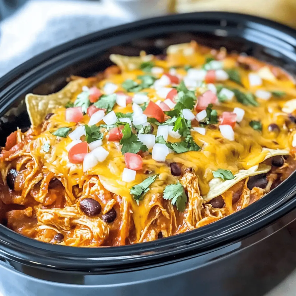 Jump to Recipe Print RecipeWith the aroma of spices swirling around the kitchen, I can’t help but feel a sense of comfort wash over me. There’s something magical about a meal simmering in the slow cooker, and my Easy Gluten-Free Crockpot Chicken Enchilada Casserole is a shining example! This dish is not just a breeze to prepare, but it’s also a terrific way to feed the whole family without fuss. Overflowing with tender pulled chicken, zesty enchilada sauce, and gooey cheese, it’s the perfect solution for busy weeknights. Plus, you can easily adapt it to be gluten-free for those who need that little extra care. Curious about how this delightful dish can transform your next dinner? Let’s dive in! Why is this casserole a dinner win? Ease of Preparation: Just toss ingredients in your slow cooker and let it do the work for you! Flavor Explosion: With zesty enchilada sauce and creamy cheese, this dish is a flavor fiesta in every bite. Crowd-Pleasing Comfort: Perfect for family gatherings or a cozy night in, it’s a dish everyone will love. Versatility: Easily tailored to your pantry staples, you can mix in extra veggies or swap proteins without losing that beloved taste. Gluten-Free Friendly: Great for everyone at the table, this recipe ensures no one misses out on deliciousness! Heartwarming Aroma: The delightful scent wafting through your home as it cooks will have everyone asking, “What’s for dinner?” Ingredients for Crockpot Chicken Enchilada Casserole • For the Casserole 2 lbs boneless, skinless chicken breasts – Main protein; chicken thighs can be used for a juicier texture. 2 cups red enchilada sauce – Adds bold flavor; opt for gluten-free varieties if necessary. 1 can (14.5 oz) fire-roasted tomatoes – Provides acidity and sweetness to balance the dish. 1 can (4 oz) diced green chiles – Offers a mild heat and enhances texture. 1 packet taco seasoning – Delivers essential seasoning; feel free to use homemade blends for a personal touch. 2 cups shredded Mexican cheese blend – Brings creaminess; substitutes like Monterey Jack or sharp cheddar work wonderfully. 1 can (15 oz) black beans, drained and rinsed – Boosts protein and fiber content; pinto beans can be used instead. 1 cup sweet corn kernels (frozen or canned) – Adds sweetness and texture; fresh corn is an excellent option too. 6 gluten-free tortillas or corn tortillas, sliced into strips – Essential for the casserole’s structure while keeping it gluten-free. Optional: 8 oz cream cheese – Elevates creaminess, making every bite even more indulgent. Fresh cilantro for garnish – Enhances flavor and adds a touch of freshness to the finished dish. Step‑by‑Step Instructions for Crockpot Chicken Enchilada Casserole Step 1: Prepare the Slow Cooker Start by lightly spraying the inner pot of your slow cooker with nonstick spray to prevent sticking. This will ensure easy cleanup later. Set it aside while you gather your ingredients and get ready to create this delicious Crockpot Chicken Enchilada Casserole. Step 2: Add the Chicken Place the 2 lbs of boneless, skinless chicken breasts directly into the slow cooker. Make sure they are evenly spaced to promote even cooking. The chicken will become tender as it simmers, infusing the casserole with flavor. Step 3: Add the Sauce and Seasoning Pour in the 2 cups of red enchilada sauce, followed by the can of fire-roasted tomatoes, diced green chiles, and taco seasoning. Gently stir to combine all these delicious ingredients around the chicken. The mixture should be well-blended, creating a fragrant base for your casserole. Step 4: Cover and Cook Cover the slow cooker with its lid and set it to cook on High for 3-4 hours or Low for 4-6 hours, up to a maximum of 8 hours on Low. The chicken is ready when it reaches a tender state, easily shreddable with a fork. Your kitchen will begin to smell amazing! Step 5: Shred the Chicken Once the cooking time is up, carefully remove the chicken breasts from the slow cooker. Use two forks or a stand mixer with a paddle attachment to shred the chicken into bite-sized pieces. Return the shredded chicken to the slow cooker, mixing it back into the flavorful sauce. Step 6: Mix in Cheese and Beans Stir in half of the 2 cups of shredded Mexican cheese, along with the drained black beans and corn. This will enhance the flavor and add heartiness to your Crockpot Chicken Enchilada Casserole. Ensure everything is combined evenly so that every bite is delicious. Step 7: Add Tortilla Strips Now, add the sliced gluten-free tortillas to the slow cooker. Gently fold them into the mixture to prevent them from becoming mushy, but ensure they are well incorporated. This adds the essential structure to your casserole while keeping it gluten-free. Step 8: Top with Remaining Cheese Sprinkle the remaining cheese evenly over the top of the casserole. This melty layer of cheese will create a beautiful, golden topping. The slow cooker still contains bubbling sauce, so the cheese will melt perfectly in the upcoming step. Step 9: Final Cooking Stage Cover the slow cooker again and cook for an additional 20-30 minutes on High, until the cheese has melted and everything is heated through. You’ll know it’s ready when the cheese is bubbling and has formed a delightful crust on top. Step 10: Enhance Creaminess (Optional) If you’d like to make the casserole even creamier, stir in the 8 oz of cream cheese just before the final cook time ends. This will give your Crockpot Chicken Enchilada Casserole an indulgent texture and flavor that everyone will love. Step 11: Garnish and Serve Once finished, garnish your casserole with fresh cilantro for a pop of color and flavor. Serve hot and enjoy the comforting, cheesy goodness that is your Easy Gluten-Free Crockpot Chicken Enchilada Casserole with family and friends! Storage Tips for Crockpot Chicken Enchilada Casserole Fridge: Store leftovers in an airtight container for up to 3-4 days. Simply reheat ge