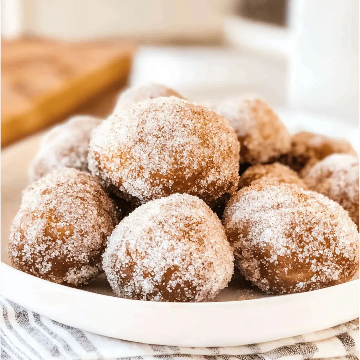 Jump to Recipe Print RecipeThe scent of cinnamon wafting through the kitchen instantly takes me back to my childhood, where every Sunday was filled with warm donuts fresh from the oven. Fast forward to today, and I’m excited to share a new favorite: Keto Donut Holes with Cinnamon Glaze. These little delights are a game-changer, offering a soft and buttery bite that rivals conventional treats while keeping your carb count in check. With just 0.5g net carbs each, they’re not only a guilt-free indulgence but also a quick and easy option for breakfast or a satisfying snack. Whether you’re navigating a low-carb lifestyle or simply looking to spice up your morning routine, these donut holes are sure to please. Ready to indulge without the weight of regret? Let’s dive into this deliciously simple recipe! Why Are These Keto Donut Holes Irresistible? Melt-in-Your-Mouth Texture: Each bite delivers a soft, buttery experience reminiscent of classic donuts without the carbs. Guilt-Free Indulgence: At just 0.5g net carbs, you can satisfy your sweet cravings without compromise. Quick & Easy: With simple ingredients and straightforward steps, these donut holes can be whipped up in no time, making them perfect for busy mornings. Versatile Flavors: Enjoy them as is, or switch up the coating with chocolate or spices for a fun twist! Perfect for Everyone: Whether you’re keto, low-carb, or just looking for a healthier treat, these donut holes cater to all. Pair them with your morning coffee or tea for a delightful experience! Keto Donut Holes Ingredients For the Dough • Water – Provides moisture to form the dough base; no substitutions necessary. • Almond Flour – Acts as the primary dry ingredient for structure; can swap with coconut flour but adjust quantity. • Eggs (lightly beaten) – Binds ingredients and adds moisture; flax eggs are a great vegan alternative. • Avocado Oil or Extra Virgin Olive Oil – Adds richness; melted coconut oil works as a good substitute. • Erythritol (granulated) – A low-carb sweetener; feel free to use any low-carb sweetener, adjusting for sweetness. • Coconut Flour – Thickens and adds texture; can replace with more almond flour, but watch absorption. • Psyllium Husk (ground) – Enhances elasticity and fiber; can omit if unavailable for a simpler recipe. • Xanthan Gum – Stabilizes and contributes chewiness; guar gum is an acceptable substitute if needed. • Pure Vanilla Extract – Lifts flavors beautifully; no replacements needed for this essential ingredient. • Baking Powder – Helps the donut holes rise; ensure it’s fresh to achieve maximum fluffiness. • Sea Salt – Enhances the overall flavor; adjust to taste for best results. For the Glaze • Butter (melted) – Provides richness and helps the cinnamon sugar adhere; substitute with a plant-based alternative for vegan options. • Low Carb Sugar Substitute (granulated) – Sweetens the exterior coating; adjust type based on personal preference. • Erythritol (powdered) – Perfect for dusting; can be replaced with other low-carb powdered sweeteners. • Cinnamon (ground) – Adds warm, aromatic sweetness; nutmeg is a delightful substitute for a different flavor twist. With these ingredients ready, you’ll be on your way to baking delicious Keto Donut Holes that keep the carbs away while still satisfying your cravings! Step‑by‑Step Instructions for Keto Donut Holes Step 1: Preheat the Oven Begin by preheating your oven to 425°F (220°C). This ensures it’s perfectly hot and ready for baking. While it heats, line a baking tray with parchment paper to prevent the donut holes from sticking and to make cleanup easier. Step 2: Prepare the Dry Ingredients In a large mixing bowl, combine almond flour, coconut flour, baking powder, psyllium husk, and xanthan gum. Use a whisk to blend these dry ingredients until well incorporated, ensuring no lumps remain. This creates a solid foundation for your Keto Donut Holes, adding structure and texture. Step 3: Create the Wet Mixture In a small saucepan, bring water to a boil. Once boiling, reduce the heat to medium-low, and whisk in the avocado oil, erythritol, and a pinch of sea salt. Keep stirring for about 2-3 minutes until the mixture is well combined and the erythritol dissolves completely, creating a smooth, sweet base. Step 4: Combine Mixtures Gradually pour the wet mixture into the dry ingredients, stirring continuously until a sticky dough forms. This should take around 2-3 minutes. Once combined, allow the dough to cool for about 5 minutes, giving it the right temperature for adding eggs without cooking them. Step 5: Integrate the Eggs Once cooled, add the lightly beaten eggs to the dough. Using a whisk, mix until the dough becomes elastic and smooth. This process will take about 1-2 minutes. Finally, fold in the pure vanilla extract to enhance the flavor of your Keto Donut Holes. Step 6: Let the Dough Rest Cover the mixing bowl with a clean kitchen towel and let the dough rest for 15-20 minutes. This allows the ingredients to meld together, ensuring a soft and airy texture for your donut holes when baked. Step 7: Shape the Dough After resting, take small portions of the dough and roll them into 1-inch balls. This should yield about 12-15 donut holes. Once shaped, place them evenly on the lined baking tray, giving each piece space to expand while baking. Step 8: Bake the Donut Holes Bake the donut holes in the preheated oven for 15 minutes at 425°F (220°C). After this, reduce the temperature to 350°F (180°C) and continue baking for an additional 10-15 minutes, or until the donut holes are golden brown and firm to the touch. Step 9: Cool Down Once baked, remove the tray from the oven and allow the donut holes to cool in the pan for 10 minutes. This cooling period helps them firm up and makes them easier to handle when coating. Step 10: Prepare the Cinnamon Glaze In a small bowl, mix together the granulated erythritol and gro