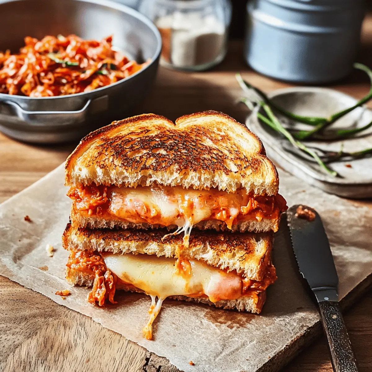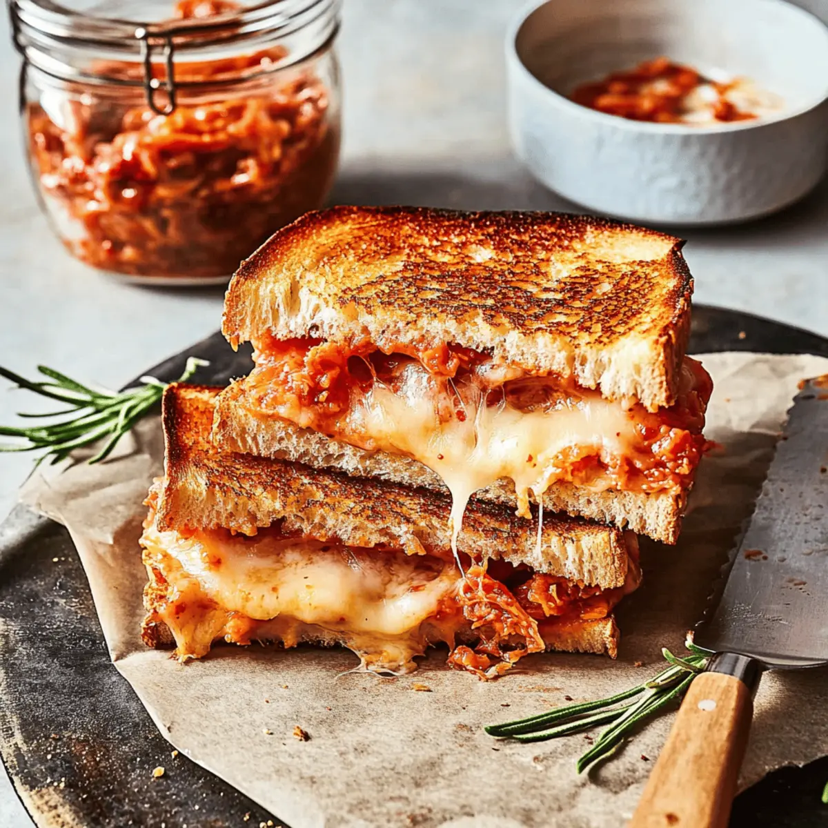 Jump to Recipe Print RecipeAs I stood in my kitchen, savoring the tantalizing aroma of melting cheese and the vibrant tang of kimchi, I couldn’t help but smile. This Viral Kimchi Grilled Cheese Fusion Sandwich has quickly become a go-to for both busy weeknights and lazy weekends. The crispy sourdough gives way to gooey cheddar, while the kimchi perks things up in a way that’s both comforting and exhilarating. Best of all, it’s a quick and easy dish that anyone can whip up, making it a perfect solution for those of us tired of the same old fast food options. Plus, it’s easily customizable: switch out the cheese or add some spice to create a sandwich uniquely yours. Ready to elevate your lunch game? Let’s dive into this delicious twist on a classic! Why is this sandwich a must-try? Comfort Meets Creativity: This Viral Kimchi Grilled Cheese Fusion Sandwich takes a beloved classic and transforms it into something spectacular, perfect for any meal. Quick and Easy: It requires minimal ingredients and less than 15 minutes, meaning you can satisfy your cravings without breaking a sweat. Endless Customization: Not a fan of cheddar? Swap it for gouda or mozzarella! Want more heat? Add jalapeños or sriracha. Each bite can be tailored to your taste. Healthy Twist: The addition of kimchi not only packs a flavor punch, but it’s also gut-friendly, making it both delicious and nutritious. Crowd-Pleasing Delight: Whether you’re hosting friends or looking for a family-friendly dinner, this sandwich is sure to wow everyone at the table! Check out my recipe for Cottage Cheese Flatbread to serve alongside these scrumptious sandwiches! Kimchi Grilled Cheese Fusion Ingredients • For the Bread Sourdough Bread – Offers a crispy, sturdy base that holds all the delicious fillings together. You can consider gluten-free bread for a gluten-sensitive option. • For the Cheese Cheddar Cheese – Provides a sharp, creamy flavor that melts beautifully inside the sandwich. Swap for gouda or mozzarella for a milder taste in your Kimchi Grilled Cheese Fusion Sandwich. • For the Filling Kimchi – Adds a spicy, tangy kick that elevates the overall flavor profile. Opt for a thick, non-watery kimchi for the best texture in your sandwich. • For Cooking Butter – Ensures a golden, crispy crust when cooked. Feel free to use vegan butter if you’re going dairy-free. Step‑by‑Step Instructions for Kimchi Grilled Cheese Fusion Sandwich Step 1: Slice the Sourdough Begin by slicing two pieces of sourdough bread into about 1-inch thick slices. Ensure that they are even for a uniform cook. The crispy texture of the sourdough will be the perfect base for your Kimchi Grilled Cheese Fusion Sandwich. Step 2: Layer the Ingredients On one slice of sourdough, layer three slices of cheddar cheese evenly to cover the bread. Next, add a generous heap of kimchi on top of the cheese, allowing the vibrant tang of kimchi to marry with the creamy cheddar. This delightful combination is the heart of your fusion sandwich. Step 3: Butter the Bread Spread melted butter generously on the outer sides of both slices of sourdough. This will ensure a golden and crispy crust as the sandwich cooks. The butter also enhances flavor, making your Kimchi Grilled Cheese Fusion Sandwich irresistibly delicious. Step 4: Cook the Sandwich Place the sandwich in an air fryer set to 400°F for approximately 10 minutes. Remember to flip it halfway through cooking to achieve that beautiful golden-brown crust on both sides. You can also use a skillet over medium-high heat and toast each side until perfectly crisp and the cheese has melted deliciously. Step 5: Slice and Serve Once cooked, remove the sandwich from the air fryer or skillet and let it rest for a minute. Then, slice the sandwich in half, revealing the gooey cheese and vibrant kimchi inside. Serve warm, optionally with some pickles on the side for a refreshing contrast. Enjoy your homemade Kimchi Grilled Cheese Fusion Sandwich! Expert Tips for Kimchi Grilled Cheese Fusion Drain Kimchi Well: Ensure you squeeze out excess liquid from kimchi to prevent a soggy sandwich—nobody loves a mushy bite! Room Temperature Cheese: Let your cheddar sit out for 15 minutes before cooking; this promotes even melting throughout your Kimchi Grilled Cheese Fusion. Low and Slow Cooking: Avoid high heat when cooking; it might burn the bread before the cheese melts. Aim for medium-high to get that golden crust without the burn. Add Unique Flavors: Spice it up with jalapeños or a touch of sriracha for an extra kick—to really make your sandwich one-of-a-kind! Experiment with Breads: While sourdough is divine, feel free to swap with other bread varieties. Just ensure they can hold the fillings without getting too soggy. What to Serve with Kimchi Grilled Cheese Fusion Sandwich Looking to create a mouthwatering meal that pairs perfectly with your Kimchi Grilled Cheese Fusion Sandwich? Crispy Pickles: These tangy, crunchy bites offer a refreshing contrast that cuts through the richness of the cheese and kimchi. Simple Green Salad: A light salad with vibrant greens and a zesty vinaigrette brings a fresh, crisp element to your plate. Tomato Soup: The classic pairing with grilled cheese, this warm and tangy soup enhances the sandwich’s flavors while adding comfort to your meal. Sweet Potato Fries: Crispy on the outside and tender on the inside, these naturally sweet fries bring a delightful texture and flavor balance. Fried Rice: Elevate your meal with a side of savory fried rice, which complements the kimchi and adds an Asian-inspired twist. IPA Beer: The hoppy notes of an IPA accentuate the zing of some kimchi and provide a refreshing contrast to the melted cheese. Chocolate Chip Cookies: End your meal on a sweet note with warm, gooey cookies for the perfect comforting dessert companion. Kimchi Grilled Cheese Fusion Variations Get ready to explore a world of delightful twists that will personalize your Kimchi Gr