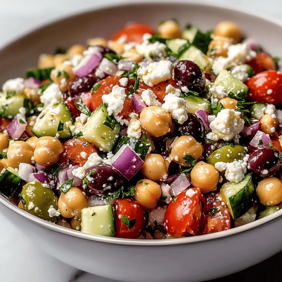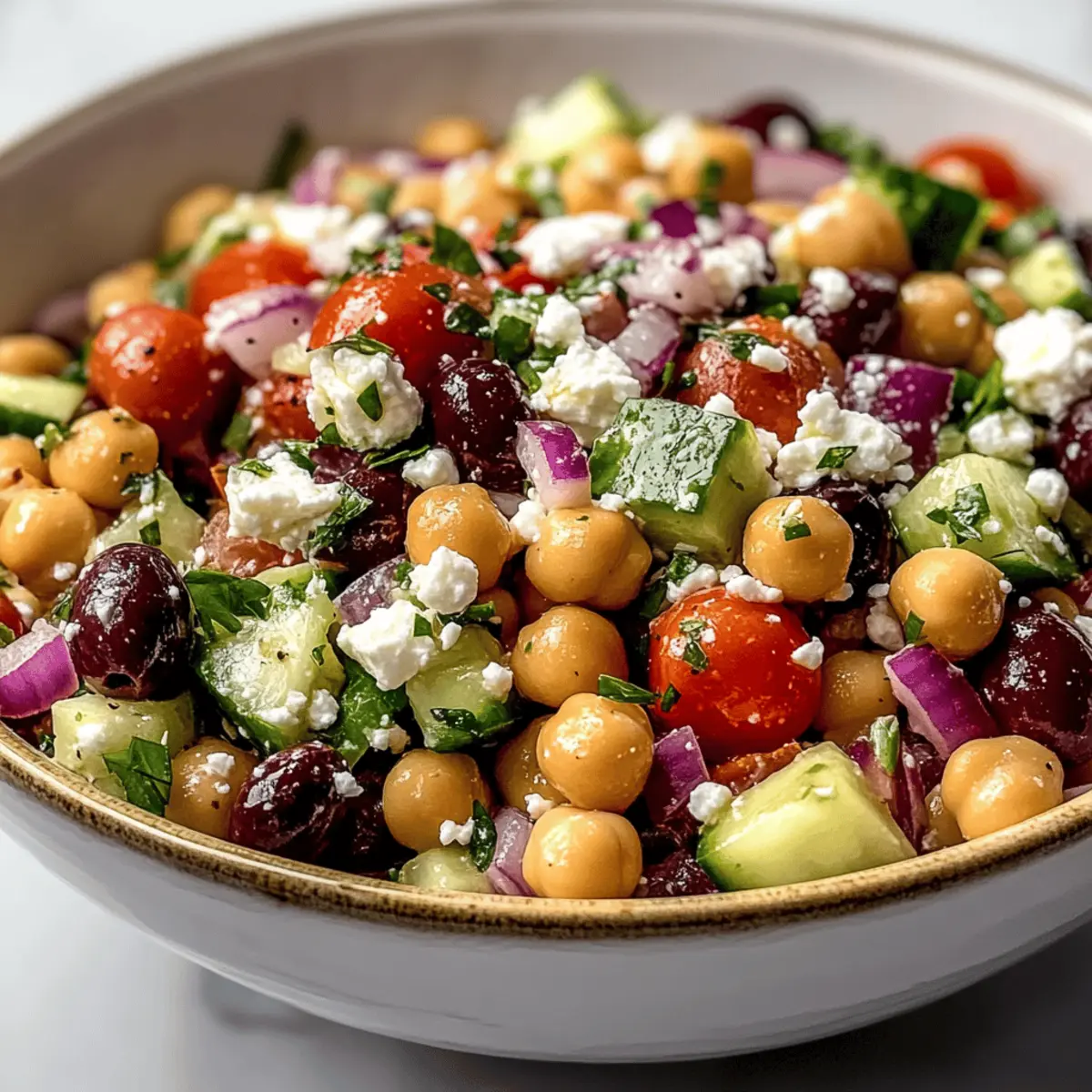 Jump to Recipe Print RecipeAs I was flipping through my favorite cookbooks one afternoon, I stumbled upon a treasure that sparked my culinary curiosity—Mediterranean Chickpea Feta Salad. This gem of a recipe is not only a feast for the eyes with its vibrant colors, but it’s also a powerhouse of nutrition. It comes together in a flash, making it an ideal choice for those busy weekdays when time is tight. Plus, it’s loaded with plant-based protein and the freshness of crisp vegetables, making it a healthy option that doesn’t skimp on flavor. The inclusion of creamy feta adds just the right tang, transforming simple ingredients into a refreshing delight. So, are you ready to embark on a culinary journey to the sun-drenched shores of the Mediterranean? Let’s dive into this easy-to-make, satisfying salad that will keep your taste buds dancing! Why is this salad a must-try? Vibrant Colors: This Mediterranean Chickpea Feta Salad bursts with an array of fresh colors that make it visually enticing. Nutritious & Protein-Packed: Loaded with chickpeas and feta, it’s a healthy choice perfect for vegetarians craving high protein. Quick & Easy: Whip it up in under 20 minutes—ideal for busy weeknights or last-minute gatherings. Versatile Ingredients: Feel free to customize! Add roasted bell peppers or swap feta for a vegan alternative for variety. Crowd-Pleasing Flavor: The mix of tangy feta, crunchy vegetables, and zesty dressing guarantees a delightful experience that everyone will love. Enjoy as a main dish, or pair it with warm pita bread or grilled chicken for a wholesome meal. For other refreshing ideas, check out Caprese Cucumber Salad or the Golden Girl Salad to add some variety to your menu! Mediterranean Chickpea Feta Salad Ingredients For the Salad • Chickpeas – A nutritious base packed with protein and fiber; always rinse before using! • Red Onion – Adds a sharp crunch; finely chop for even distribution. • Cherry Tomatoes – Offers bursts of sweetness; choose firm, ripe ones for the best flavor. • Cucumber – Provides refreshing crunch; peel, seed, and dice for optimal texture. • Kalamata Olives – Imparts a rich briny flavor; halve for easy eating. • Feta Cheese – Creamy and tangy; opt for high-quality, imported feta for enhanced taste. • Fresh Parsley & Mint – Bright herbal notes elevate the dish; buy fresh for the best flavor. For the Dressing • Olive Oil – The heart of the dressing; select a top-notch extra virgin for depth. • Lemon Juice – Adds a refreshing acidity; fresh juice is always best for vibrant flavor. • Garlic – Introduces a savory element; mince finely to ensure it’s well incorporated. • Dried Oregano – Provides earthiness; feel free to adjust based on your herb preference. Elevate your culinary experience with this delightful Mediterranean Chickpea Feta Salad! Step‑by‑Step Instructions for Mediterranean Chickpea Feta Salad Step 1: Prepare Chickpeas Begin by draining a can of chickpeas and placing them in a colander. Rinse thoroughly under cold water to remove excess starch, then spread them out on a clean kitchen towel to dry completely for about 5–10 minutes. This step ensures your Mediterranean Chickpea Feta Salad remains crisp instead of soggy when dressed. Step 2: Chop Vegetables Finely chop half a red onion, and halve a handful of cherry tomatoes, ensuring they are firm and ripe for maximum sweetness. Next, peel, seed, and dice half a cucumber into bite-sized pieces. For the olives, slice a handful of Kalamata olives in half. Set these vibrant veggies aside to add freshness to your salad. Step 3: Make Dressing In a medium bowl, whisk together ¼ cup of high-quality olive oil and the juice of one lemon until combined. Add one clove of minced garlic and a teaspoon of dried oregano, then season generously with salt and pepper. Taste and adjust for acidity or seasoning if desired, bringing a zesty brightness to your Mediterranean Chickpea Feta Salad. Step 4: Combine Ingredients In a large mixing bowl, add the dried chickpeas, chopped red onion, halved tomatoes, diced cucumber, and olives. Crumble in your feta cheese, and toss in a handful of freshly chopped parsley and mint, stirring gently to combine all the flavors. The colors and textures will begin to create a beautiful medley. Step 5: Serve Drizzle the dressing over the salad mixture and gently toss until evenly coated, ensuring all ingredients are well integrated. You can serve the Mediterranean Chickpea Feta Salad immediately or, for enhanced flavor, chill it in the refrigerator for about 30 minutes before serving. Garnish with extra feta and herbs to elevate its vibrant presentation. Expert Tips for Mediterranean Chickpea Feta Salad Dry Thoroughly: Ensure chickpeas and vegetables are completely dry before dressing. This prevents a soggy Mediterranean Chickpea Feta Salad. Balance Flavors: Taste your dressing before adding it to the salad. More lemon juice can enhance brightness if needed. Dress Last Minute: For the best texture, dress the salad right before serving, especially if making ahead of time. Customize Ingredients: Feel free to substitute ingredients like cannellini beans or bell peppers for a different twist on the classic salad. Quality Matters: Using high-quality feta cheese and olive oil significantly improves the overall flavor of your salad. What to Serve with Mediterranean Chickpea Feta Salad Bright, fresh elements create a full meal when paired with this vibrant Mediterranean delight. Warm Pita Bread: Fluffy and soft, warm pita serves as a great scoop for your salad, enhancing every bite with its comforting texture. Grilled Chicken: Juicy and smoky chicken provides a protein boost, complementing the salad’s freshness and making for a hearty meal. Quinoa or Couscous: A nutty side like quinoa or couscous adds substance and a chewy texture that pairs beautifully with the salad’s crisp ingredients. Tzatziki Sauce: This creamy, cucumber-y