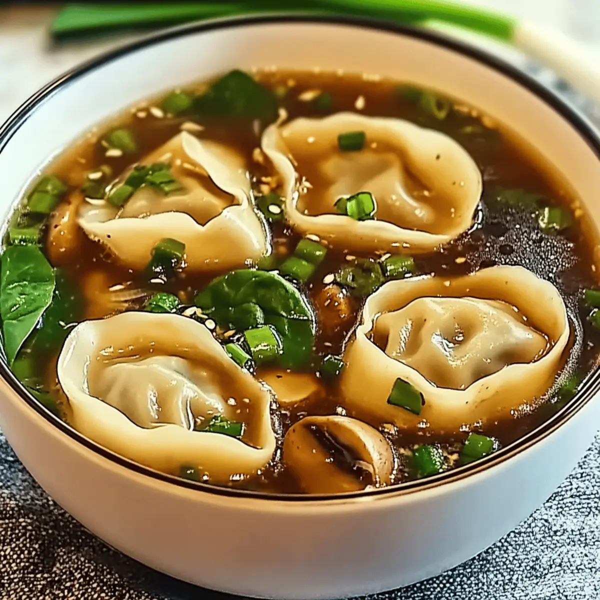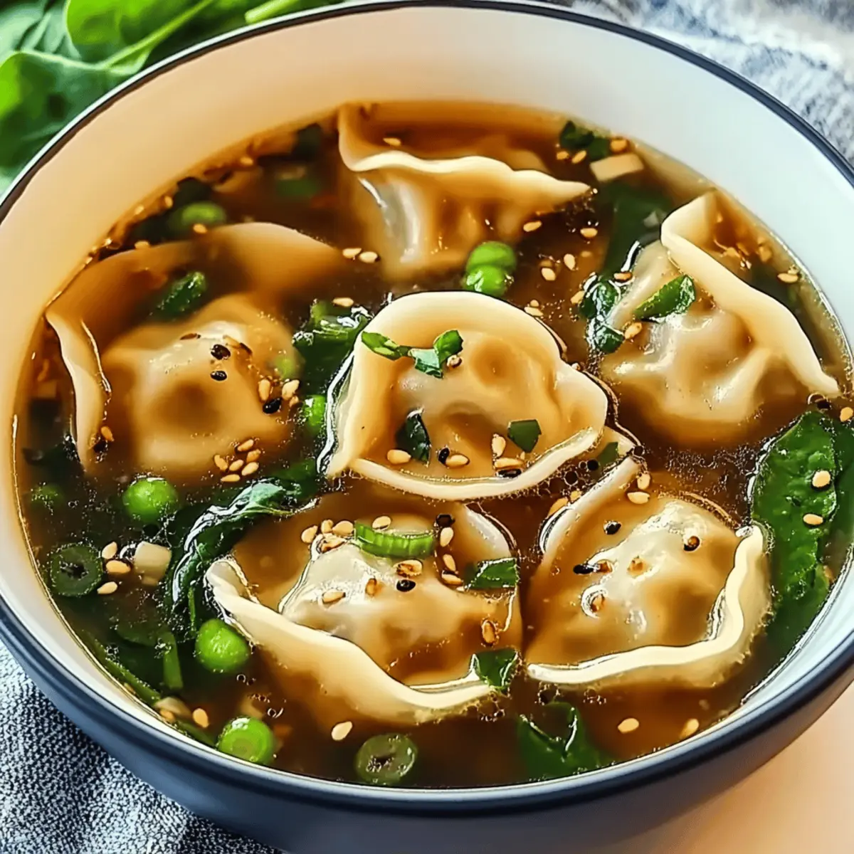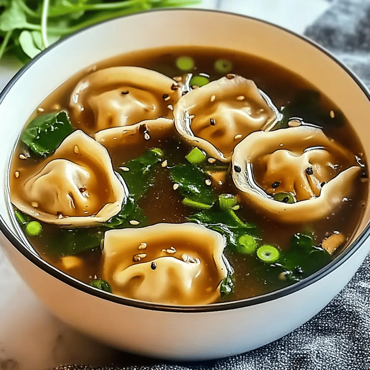 Jump to Recipe Print Recipe“Did you hear about the new soup that’s making waves in homes everywhere?” As I stirred my bubbling pot of Potsticker Soup, the enticing aroma filled the air, and I knew I had discovered a cozy gem perfect for any weeknight dinner. This Asian-inspired delight is not just quick and easy; it also brings a comforting warmth to your table, blending juicy dumplings with a rich, flavorful broth and vibrant veggies. Whether you’re a busy professional or a home chef eager to escape the fast-food trap, this recipe promises satisfying flavors without the hassle. Plus, there are options for everyone—consider a vegetarian twist or gluten-free adaptions that make this soup accessible for all. So, are you ready to dive into a bowl of deliciousness? Let’s get cooking! Why is Potsticker Soup a must-try? Comforting, this potsticker soup warms you from the inside out, making every bite feel like a hug! Quick and easy, it’s perfect for those busy weeknights when you want something delicious without spending hours in the kitchen. Adaptable, you can easily swap in your favorite veggies to suit your taste or dietary needs. Flavor-packed, the combination of ginger, garlic, and soy sauce creates a broth that’s simply irresistible. Dive into the unique world of Asian-inspired flavors with this recipe, and if you’re in the mood for more soupy goodness, check out our Potato Soup Comfort for another warm treat! Potsticker Soup Ingredients For the Soup Base Frozen Potstickers – 12-15 pieces; they serve as the hearty protein component, making it a satisfying meal. Chicken Broth or Vegetable Broth – 4 cups; this adds depth and flavor to your potsticker soup, with vegetable broth as a great vegetarian option. Soy Sauce – 1 tbsp; enhances the umami flavor of the broth; swap with tamari for a gluten-free alternative. Sesame Oil – 1 tbsp; adds nuttiness and richness; olive oil works in a pinch if needed. For the Aromatics Grated Ginger – 2 tsp; provides warmth and a fragrant aroma; fresh is best! Minced Garlic – 2 cloves; elevates the overall flavor and aroma, with fresh being preferred for optimal taste. For the Vegetables Chopped Green Onions – 2-3, for garnish; they add a fresh touch and a slight crunch to your bowl. Sliced Mushrooms (optional) – 1/2 cup; gives additional umami and texture to the dish. Spinach or Bok Choy (optional) – 1/2 cup; boosts nutrition and adds vibrant color, with kale being a suitable substitute. For the Seasoning Rice Vinegar (optional) – 1 tbsp; brightens the flavors wonderfully, but can be omitted if you’re out. Salt & Pepper – To taste; essential for enhancing the soup flavor; adjust as you prefer. Chili Oil or Red Pepper Flakes (optional) – 1 tsp; for those seeking a spicy kick; adjust to your heat level. Dive into the heart of potsticker soup with these delightful ingredients, and embrace the warmth it brings to your dining experience! Step‑by‑Step Instructions for Potsticker Soup Step 1: Prepare the Broth Begin by heating 1 tablespoon of sesame oil in a large pot over medium heat. Once the oil shimmers, add 2 cloves of minced garlic and 2 teaspoons of grated ginger, sautéing for about 30 seconds until they become fragrant. This aromatic foundation will give your potsticker soup a lovely depth of flavor. Step 2: Simmer the Broth Pour in 4 cups of chicken or vegetable broth into the pot, bringing the mixture to a gentle simmer. As it heats, you’ll notice steam rising and bubbles forming. Allow it to simmer for about 5 minutes to meld the flavors together beautifully, providing a warm and comforting base for your soup. Step 3: Add Potstickers Gently add 12-15 frozen potstickers to the simmering broth. Stir carefully, then cover the pot, cooking for approximately 5-7 minutes or according to package instructions. The potstickers should be heated through and tender while keeping their delightful, chewy texture. Step 4: Incorporate Vegetables If you’re using any optional vegetables, now’s the time to add them! Toss in ½ cup of sliced mushrooms and ½ cup of spinach or bok choy during the last 2-3 minutes of cooking. This not only boosts the nutrition but also adds a pop of color to your potsticker soup. Step 5: Season and Serve Stir in 1 tablespoon of soy sauce and, if desired, 1 tablespoon of rice vinegar, adjusting salt and pepper to taste. Once everything is well combined and heated through, ladle the soup into bowls. Finish by garnishing with chopped green onions, and for a spicy kick, drizzle with chili oil or sprinkle red pepper flakes as desired. Potsticker Soup Variations Feel free to get creative with this potsticker soup recipe and make it your own with these delightful twists! Gluten-Free: Use gluten-free potstickers and swap soy sauce for tamari to keep it deliciously gluten-free. Vegan Delight: Substitute the chicken broth with vegetable broth and add tofu for a hearty, plant-based option. Protein-Packed: Add cooked shredded chicken, shrimp, or even a poached egg for extra protein and comfort in every bowl. Vegetable Medley: Incorporate a mix of seasonal vegetables like bell peppers, carrots, or snap peas for a colorful, nutritious addition. Creamy Texture: Stir in a splash of coconut milk for a creamy, rich broth that elevates the comforting nature of the soup. Herbal Infusion: Toss in fresh herbs like cilantro or basil just before serving for an aromatic finish that brightens the soup. Spicy Kick: Enhance the heat level with fresh sliced jalapeños or a dash of sriracha for those who love an extra kick. Asian Twist: For a different flavor profile, experiment with adding miso paste during the simmering phase for an umami burst. Explore these variations as you embrace the flexibility of your potsticker soup. And if you’re in the mood for something different, make sure to check out our Thai Chicken Soup for another comforting delight! Expert Tips for Potsticker Soup • Quality Matters: Use high-qu