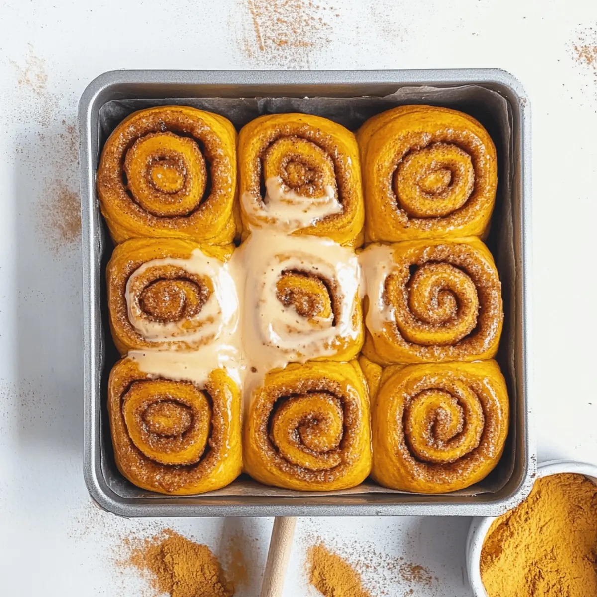 Jump to Recipe Print RecipeThere’s something magical about walking into a kitchen filled with the sweet, spicy aroma of freshly baked Pumpkin Cinnamon Rolls. On a crisp autumn morning, when the leaves are turning and a warm cup of coffee beckons, these delightful rolls bring ultimate comfort and joy. Soft and fluffy, the dough hugs a rich pumpkin brown sugar filling, then is lovingly topped with a luscious coffee maple cream cheese icing. Not only do they make for an irresistible brunch centerpiece, but they’re also perfect for meal prep—you can easily make them in advance or even freeze for cozy weekend treats. Ready to indulge in this seasonal goodness? Let’s dive into the comforting world of homemade Pumpkin Cinnamon Rolls! Why are these Pumpkin Cinnamon Rolls special? Irresistible aroma: The warm spices and sweet pumpkin filling fill your kitchen with a cozy, inviting fragrance that’s perfect for autumn mornings. Versatile and flexible: Feel free to experiment with different spices or even swap pumpkin for other purees like butternut squash. Make ahead: These rolls can be prepared in advance, making breakfast a breeze—just pop them in the oven fresh for your weekend brunch or holiday hosting, just like with these delicious Cinnamon Swirl Bundt options. Gooey indulgence: The combination of soft dough and rich, creamy coffee maple glaze creates a delightful texture that keeps everyone coming back for more. Crowd pleaser: Whether for a family gathering or a cozy brunch with friends, these Pumpkin Cinnamon Rolls are sure to impress and evoke joyful memories around the table. Pumpkin Cinnamon Rolls Ingredients For the Dough • All-Purpose Flour – Provides structure and texture; for a denser roll, use bread flour. • Milk – Adds moisture and richness; lukewarm milk helps with yeast activation. • Active Dry Yeast – Leavens dough for that soft and fluffy texture; instant yeast is a fine 1:1 substitute. • Sugar – Sweetens the dough and filling; brown sugar deepens flavor, while coconut sugar offers a less processed option. • Pumpkin Puree – Adds moisture and a delightful pumpkin flavor; reduced puree brings a more intense taste. • Butter – Enriches the dough and creates tenderness; feel free to lighten up with 175g in the filling. • Eggs – Contributes to richness, structure, and binding; for a vegan version, a flax egg works great. • Ground Cinnamon – Elevates flavor in both dough and filling; swap with cardamom for a twist. For the Filling • Brown Sugar – Sweetens and enhances the filling; can be replaced with coconut or granulated sugar if desired. • Ground Cinnamon – Essential for that cozy autumn flavor; you may also mix in nutmeg or ginger for variety. For the Icing • Espresso Powder – Boosts the icing flavor; finely ground instant coffee can serve as a substitute. • Cream Cheese – Adds delightful tanginess to the icing; a vegan version can be used for dairy-free diets. • Maple Syrup – Sweetens and adds depth; feel free to use honey or agave in its place. With these ingredients, you are just a few steps away from creating your own heavenly Pumpkin Cinnamon Rolls that will have everyone asking for seconds! Step‑by‑Step Instructions for Pumpkin Cinnamon Rolls Step 1: Prepare the Dough In a mixing bowl, combine 1 cup of lukewarm milk with 2 teaspoons of active dry yeast, letting it froth for about 5–10 minutes. Meanwhile, in a separate bowl, whisk together 3 ½ cups of all-purpose flour, ¼ cup of sugar, and 2 beaten eggs. Stir in ½ cup of melted butter, then gradually add the yeast mixture, kneading until the dough is smooth. Allow the dough to rise in a warm place for 1–1 ½ hours or until doubled in size. Step 2: Reduce the Pumpkin Puree In a small saucepan, add 1 cup of pumpkin puree and cook over medium heat for about 10 minutes, stirring frequently until the puree has reduced in volume and thickened. This step enhances the pumpkin flavor, making your Pumpkin Cinnamon Rolls even more delightful. Once thickened, remove from heat and allow to cool slightly before using in the filling. Step 3: Make the Filling In a bowl, mix the reduced pumpkin puree with ½ cup of brown sugar, 2 teaspoons of ground cinnamon, and ½ cup of softened butter until well combined. The result should be a smooth, spreadable filling that is rich and sweet. Set this mixture aside while you roll out the dough for your Pumpkin Cinnamon Rolls. Step 4: Roll and Assemble On a floured surface, roll the risen dough into a large rectangle, about ¼ inch thick. Spread the pumpkin filling evenly over the dough, ensuring you reach all corners. Starting from one long edge, carefully roll the dough tightly into a log. Once rolled, slice into 12 equal sections and place them spaced apart in a greased baking dish. Step 5: Allow to Rise Again Cover the baking dish with a clean kitchen towel and let the rolls rise in a warm environment for an additional 30–45 minutes. They should become puffy and nearly double in size, ensuring a light and fluffy texture for your Pumpkin Cinnamon Rolls once baked. Step 6: Bake the Rolls Preheat your oven to 350°F (175°C). Once the rolls have risen, bake them in the preheated oven for 25–30 minutes or until they are golden brown and the tops are slightly firm to the touch. Keep an eye on them; you want that beautiful golden color indicating they’re perfectly baked. Step 7: Prepare the Icing While the rolls are baking, whip together 4 ounces of softened cream cheese, ¼ cup of butter, 1 cup of powdered sugar, 1 tablespoon of espresso powder, and 2 tablespoons of maple syrup in a bowl until smooth and creamy. This delicious coffee maple cream cheese icing will complement your freshly baked Pumpkin Cinnamon Rolls beautifully. Step 8: Drizzle and Serve Once the rolls are done baking, allow them to cool in the baking dish for about 10 minutes before drizzling the icing generously over the warm rolls. This allows the icing to 