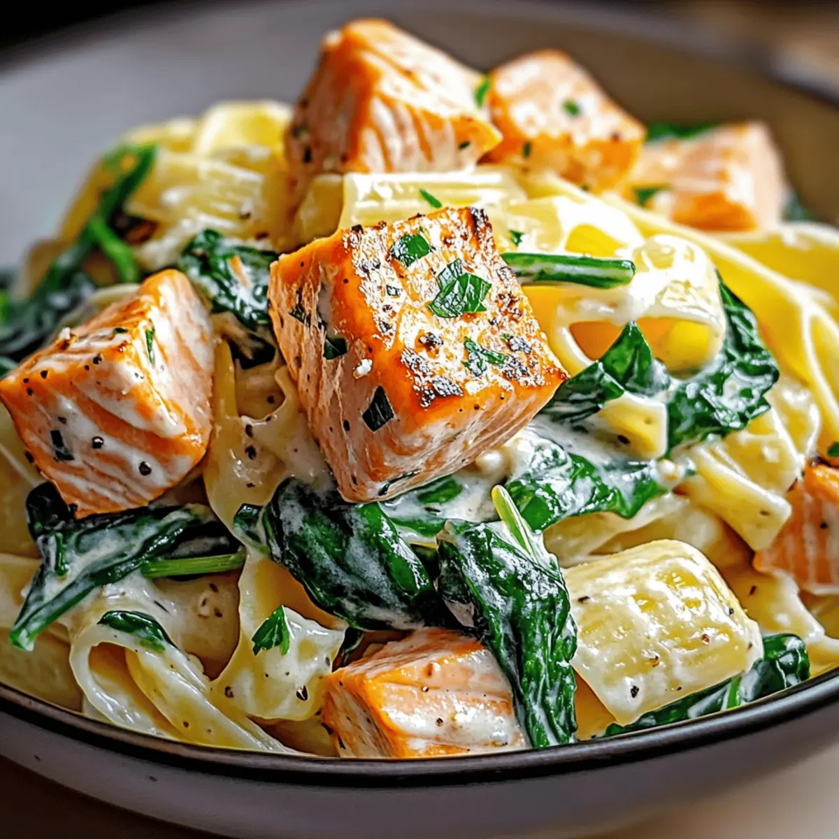Jump to Recipe Print RecipeThe aroma of sautéed garlic and fresh herbs wafts through the kitchen, instantly igniting my love for home cooking. Today, I’m thrilled to share my Creamy Salmon Spinach Pasta Dish, a recipe that perfectly balances indulgence and nutrition. With tender, flaky salmon nestled among vibrant spinach and tossed with al dente pasta, this dish strikes a harmonious medley of Mediterranean flavors. Not only is it a quick weeknight dinner that can be pulled together in under 30 minutes, but it’s also a comforting and nutritious option that turns any evening into a special occasion. Let’s dive into the effortless steps to create this delightful dish that will leave everyone at the table asking for seconds. Are you ready to transform your weeknight meals? Why is Salmon Spinach Pasta a Must-Try? Quick and Easy: With just one pan and under 30 minutes, this dish is perfect for busy weeknights, freeing up your time to enjoy with loved ones. Nutritious Ingredients: Packed with protein-rich salmon and vibrant spinach, every bite delivers essential nutrients without sacrificing flavor. Creamy Indulgence: The rich garlic Parmesan cream sauce elevates simple pasta to a comforting experience that’s sure to impress. Versatile Options: Feel free to customize with extras like sun-dried tomatoes or a splash of lemon juice from your favorite Wild Mushroom Pasta for a unique twist! Crowd-Pleaser: Whether it’s a family dinner or a gathering with friends, this dish is guaranteed to delight every palate. Salmon Spinach Pasta Dish Ingredients • Here’s everything you need for a delicious Salmon Spinach Pasta Dish! For the Pasta Fettuccine or Linguine – 8 ounces, providing the perfect base for this creamy delight; feel free to use whole wheat or gluten-free pasta for a healthier version. For Cooking Olive Oil – 2 tablespoons, ideal for sautéing garlic and cooking the salmon; can be replaced with any cooking oil. Garlic – 2 cloves, minced, which infuses aromatic flavors into the sauce; fresh is best, but garlic powder works in a pinch. For the Main Salmon Fillet – 1 pound, skin removed; the star protein of this dish that delivers wonderful taste and texture, or swap in shrimp or chicken if preferred. Spinach – 4 cups, washed and roughly chopped, adding vibrant color and nutrition; kale or other leafy greens are great substitutes. For the Creamy Sauce Heavy Cream – 1 cup, ensuring a rich and luxurious sauce; opt for half-and-half for a lighter touch or plant-based cream for a dairy-free option. Parmesan Cheese – 1/2 cup, grated, enhancing the nuttiness and depth of flavors; for a dairy-free alternative, use nutritional yeast. Lemon Zest – 1 teaspoon, brightening up the dish; can be omitted if you’re steering clear of citrus. Lemon Juice – 2 tablespoons, balancing the creaminess with a lovely acidity; vinegar can stand in if you need. Salt & Pepper – To taste, essential for seasoning; always adjust before serving for maximum flavor enhancement. Red Pepper Flakes – 1/4 teaspoon (optional), introducing a kick if desired; leave out for a milder experience. For Garnish Fresh Parsley – Chopped, adding a touch of freshness and visual appeal to the final presentation. With these ingredients in hand, you’re ready to create a Salmon Spinach Pasta Dish that is not only quick and easy but truly delicious. Let’s get cooking! Step‑by‑Step Instructions for Salmon Spinach Pasta Dish Step 1: Boil the Pasta Start by filling a large pot with water and bring it to a rolling boil. Add a generous pinch of salt to the water for flavor. Once boiling, add in 8 ounces of fettuccine or linguine and cook according to the package instructions, typically around 8-10 minutes, until the pasta is al dente. Stir occasionally to prevent sticking. Step 2: Reserve Pasta Water Before draining the pasta, be sure to reserve 1 cup of the pasta cooking water and set it aside in a bowl. This starchy water will help adjust the consistency of our creamy sauce later on. Drain the pasta in a colander and let it sit while prepping the rest of the Salmon Spinach Pasta Dish. Step 3: Prepare the Salmon Season 1 pound of skinless salmon fillet with salt, pepper, and a squeeze of fresh lemon juice. Heat 2 tablespoons of olive oil in a large skillet over medium heat. Once hot, gently place the salmon into the skillet and cook for 4-5 minutes per side, or until the salmon flakes easily with a fork. Remove it from the skillet and flake the salmon into bite-sized pieces. Step 4: Sauté Garlic In the same skillet used to cook the salmon, add the minced garlic and sauté over medium heat for about 30 seconds, stirring frequently until fragrant. This will infuse the oil with a delicious garlic flavor, preparing the base for our creamy sauce. Be careful not to let the garlic burn, as it can turn bitter. Step 5: Cook the Spinach Next, add 4 cups of washed and roughly chopped spinach to the skillet. Cook for 2-3 minutes, stirring frequently until the spinach is wilted and bright green. The volume of spinach will reduce significantly, adding a nutritious component to the Salmon Spinach Pasta Dish without overwhelming it. Step 6: Create the Creamy Sauce Lower the heat and pour in 1 cup of heavy cream, stirring to combine with the sautéed garlic and spinach. Allow the mixture to heat for 1-2 minutes until it begins to bubble gently. The cream will create a rich and velvety sauce that complements the ingredients beautifully. Step 7: Add Cheese and Seasonings Stir in 1/2 cup of grated Parmesan cheese until it melts smoothly into the creamy sauce. Next, add 1 teaspoon of lemon zest, 2 tablespoons of lemon juice, and 1/4 teaspoon of red pepper flakes if using. Simmer the sauce on low heat for 2-3 minutes, stirring occasionally, to marry all the flavors together. Step 8: Combine Pasta and Sauce Add the drained pasta to the skillet and mix well, ensuring the fettuccine or linguine is fully coated in the luscious sauc