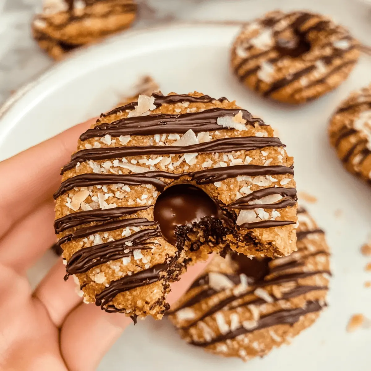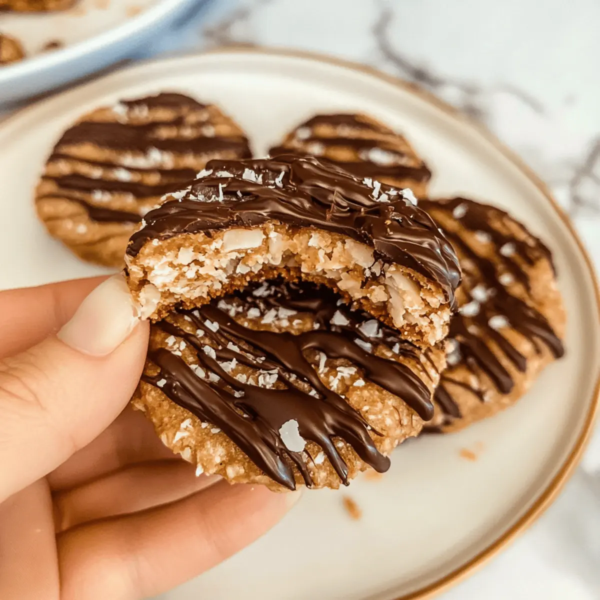 Jump to Recipe Print RecipeAs I rummaged through my cupboard searching for a sweet treat, I stumbled upon a few simple ingredients that transformed an ordinary day into a baking adventure. This all led me to create these irresistible Vegan Gluten-Free Samoa Girl Scout Cookies. With layers of sweet caramel, toasty coconut, and rich chocolate, these cookies are not just a delightful nod to the memories of Girl Scout cookie season; they are also a healthier twist on a beloved classic. Made with only five wholesome ingredients, they’re quick to prepare and make for the perfect chewy snack or dessert. Whether you’re craving something indulgent without the guilt or looking for an impressive homemade gift, these cookies will satisfy your taste buds and have everyone asking for the recipe. Curious about how to bring this nostalgia to life in your kitchen? Let’s dive into the steps! Why Make Vegan Samoa Cookies? Simplicity at Its Best: With just five wholesome ingredients, this recipe is easy for everyone, from novice bakers to seasoned chefs. Rich, Indulgent Flavor: Each bite offers a delightful mix of sweet caramel, toasted coconut, and smooth chocolate, transforming your cookie cravings into a guilt-free treat. Vegan and Gluten-Free: Perfect for those with dietary restrictions, these cookies ensure everyone can participate in the indulgence. Quick to Prepare: Whip up a batch in no time, making them ideal for spontaneous dessert cravings or those last-minute gatherings. Crowd-Pleasing Treat: Bring these cookies to your next gathering, and watch as they become the star of the show, sparking conversations that make memories—just like the original Girl Scout cookies. Looking for more tasty variations? Check out my Brown Sugar Cookies for another delightful twist! Scout Cookies Ingredients • Here’s everything you need to create these delicious Vegan Gluten-Free Samoa Girl Scout Cookies! For the Cookie Base Almond Flour – Adds structure and a nutty flavor; substitute with oat flour for a different taste. Pure Maple Syrup – Provides natural sweetness and moisture; you can swap it with agave syrup or honey for a different sweet note. For the Caramel Filling Medjool Dates – Essential for making a smooth caramel; make sure they’re pitted for easier blending. For the Topping Shredded Coconut – Toasted to enhance flavor and texture; opt for unsweetened for a healthier snack. Dark Chocolate Chips – Offers richness and a decadent finish; use dairy-free chocolate for a vegan option or replace with carob chips if preferred. Dive into this delightful cookie adventure and unleash the flavors of the classic Scout Cookies with a modern twist! Step‑by‑Step Instructions for Vegan Gluten-Free Samoa Girl Scout Cookies Step 1: Preheat the Oven Begin this cookie adventure by preheating your oven to 250°F (120°C). While the oven warms up, line a baking sheet with parchment paper to prevent sticking and ensure easy cleanup later. This crucial first step sets the stage for baking your delightful Samoa cookies to perfection. Step 2: Make the Cookie Dough In a mixing bowl, combine almond flour and pure maple syrup to create a smooth dough. Use your hands or a spatula to mix until the ingredients are fully integrated. Once smooth, place the dough between two pieces of parchment paper and roll it out to 1/4 inch thickness, ensuring even consistency for even baking. Step 3: Cut Out Cookie Shapes Carefully remove the top layer of parchment paper and use cookie cutters or a sharp knife to cut out desired shapes from the rolled dough. Create small holes in the center of each cookie using a smaller cutter or a straw, mimicking the classic shape of Scout cookies. These holes will help the cookies bake evenly and hold the caramel later. Step 4: Bake the Cookies Transfer the cut-out cookies onto the prepared baking sheet and place them in the preheated oven. Bake your Samoa cookies for 25-30 minutes, or until they are set and the edges turn a light golden brown. Keep an eye on them, as ovens can vary; overbaking may lead to dryness. Step 5: Prepare the Date Caramel While the cookies are baking, soak pitted Medjool dates in hot water for about 10 minutes to soften. After soaking, drain the dates and place them in a blender. Blend until smooth to create a luscious caramel filling, which will add a rich sweetness to your Samoa cookies. Step 6: Toast the Coconut In a skillet over medium heat, add shredded coconut and toast it for 5-7 minutes, stirring frequently until it reaches a golden brown. Keep a close watch, as coconut can burn quickly! This step enhances the flavor and texture, creating the crunchy topping that finishes your vegan Samoa cookies beautifully. Step 7: Assemble the Cookies Once the cookies have cooled, it’s time to assemble your delightful treats. Spread a generous layer of the smooth date caramel onto each cookie, and then gently press them into the toasted coconut. This delicious layer will create a wonderfully chewy bite contrasting with the crunchy coconut. Step 8: Melt the Dark Chocolate Melt the dark chocolate chips in a microwave-safe bowl in 20-second intervals, stirring in between, until fully melted and smooth. This rich chocolate layer will coat your assembled Samoa cookies, adding an indulgent touch that ties all the flavors together beautifully. Step 9: Dip and Set the Cookies Carefully dip the base of each cookie into the melted dark chocolate, ensuring an even coat. For an elegant touch, drizzle additional chocolate over the top of the cookies. Once dipped, place the cookies back on the parchment-lined baking sheet and freeze them for about 20 minutes to set the chocolate before serving. What to Serve with Vegan Gluten-Free Samoa Girl Scout Cookies Imagine a cozy afternoon filled with delightful treats that spark joy and nostalgia, perfectly paired with refreshing beverages and sweet sides. Fresh Berries: Bright, juicy berries like strawberries or raspberries add a refres
