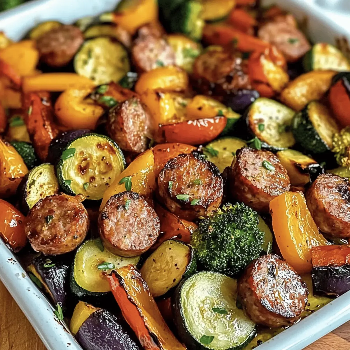 Jump to Recipe Print RecipeAs I stepped into the kitchen, the aroma of savory Italian sausage mixed with colorful veggies filled the air, instantly making my stomach rumble. Today, I’m excited to share my go-to recipe for Easy Sheet Pan Sausage & Veggies—a one-pan meal that’s not only a breeze to whip up but also perfect for those busy weeknights when time is of the essence. In just 39 minutes, you can savor a delightful dinner with minimal cleanup. The best part? This dish effortlessly combines hearty flavors with vibrant vegetables, making it a hit for both meat-lovers and veggie enthusiasts alike. What’s your favorite busy night meal? Let’s get started on this delicious adventure! Why is this recipe a game changer? Simplicity at its finest: This sheet pan meal requires minimal prep and just one pan, making cleanup a breeze. Flavor-packed goodness: The savory sausage and caramelized veggies create a delightful marriage of tastes that will satisfy any palate. Versatile options: Swap out ingredients based on what you have on hand—try with chicken sausage or seasonal veggies! Quick dinner solution: With just 39 minutes to cook, you’ll have a delicious dinner ready in no time, perfect for busy weeknights. Crowd-pleaser treat: It’s an ideal dish for family gatherings or cozy weeknight dinners; everyone will love it! Don’t forget to check out my Chicken Sausage Broccoli recipe for another fantastic meal idea. Sheet Pan Sausage & Veggies Ingredients For the Sausage & Veggies Italian Sausage – Adds savory flavor and protein; choose sweet or spicy based on your craving. Bell Peppers – Provides vibrant color and natural sweetness; any sweet pepper variety works beautifully. Red Onion – Brings a touch of sweetness; feel free to use yellow onion for a milder taste. Broccoli Florets – Adds crunch and a burst of nutrients; substitute with cauliflower for a different texture. Zucchini – Offers moisture and a tender bite; summer squash or asparagus can be used instead. Baby Potatoes – Helps create a hearty base; you can use any small potato, just cut larger ones to size. For Seasoning Olive Oil – Elevates flavor and aids in roasting; avocado oil can substitute for a higher smoke point. Garlic Powder – Introduces aromatic richness; swap for fresh minced garlic (1 clove = 1/8 tsp powder). Onion Powder – Complements the onion flavor; omit if you have enough fresh onion in the mix. Paprika – Adds a hint of smokiness; smoked paprika intensifies that flavor for those who love it. Salt and Pepper – Essential for seasoning; adjust to your taste for the perfect flavor balance. For Garnish Fresh Parsley (optional) – A lovely touch of color and freshness; can be left out if needed. Now that you have all the ingredients laid out, you’re just a step away from creating this mouthwatering Sheet Pan Sausage & Veggies dish that’s sure to delight everyone at the table! Step‑by‑Step Instructions for Easy Sheet Pan Sausage & Veggies Step 1: Preheat the Oven Begin by preheating your oven to 400°F (200°C). This temperature is key for roasting the sausage and vegetables evenly, ensuring they’re perfectly caramelized. While the oven heats, gather your equipment: a large mixing bowl, a sharp knife, a cutting board, and a large sheet pan. Step 2: Prepare the Vegetables Wash and slice the bell peppers, red onion, broccoli, zucchini, and baby potatoes into bite-sized pieces. Aim for uniform sizes to promote even cooking. Place all the chopped vegetables into the large mixing bowl, creating a vibrant medley for your Easy Sheet Pan Sausage & Veggies. Step 3: Add the Sausage Cut the Italian sausage into bite-sized pieces, ensuring they’re not too small to dry out during baking. Add the sausage to the bowl of vegetables, allowing the flavors to mingle beautifully. This combination will result in a hearty and satisfying one-pan meal. Step 4: Season the Mixture Drizzle the mixture with olive oil and sprinkle with garlic powder, onion powder, paprika, salt, and pepper. Use your hands or a large spoon to toss the ingredients together until everything is evenly coated. This step enhances the flavors and ensures each piece gets deliciously seasoned. Step 5: Arrange on the Pan Spread the sausage and veggie mixture in a single layer on the large sheet pan. Avoid overcrowding the pan to encourage proper roasting. The goal is to have everything spread out so each component can caramelize beautifully, adding flavor and texture to your Easy Sheet Pan Sausage & Veggies. Step 6: Bake Place the sheet pan in the preheated oven and bake for 30-35 minutes. Halfway through, take a moment to stir the mixture, ensuring even cooking. You’ll know it’s done when the sausage is cooked through and the veggies are tender with slightly charred edges, creating a mouthwatering aroma. Step 7: Garnish and Serve Once baked, remove the pan from the oven and sprinkle with fresh parsley for a touch of color and freshness. Allow the dish to cool for a short time before serving warm. This hearty and vibrant Easy Sheet Pan Sausage & Veggies is now ready to be enjoyed at your dinner table! How to Store and Freeze Sheet Pan Sausage & Veggies Fridge: Store leftovers in an airtight container for up to 3 days. Simply reheat in the oven or microwave before enjoying your delicious sheet pan sausage & veggies again. Freezer: For longer storage, freeze in airtight containers for up to 3 months. Thaw overnight in the fridge before reheating for the best texture and flavor. Make-Ahead: You can prepare the mixture ahead of time by storing the unbaked ingredients covered in the refrigerator for up to 24 hours. Reheating: To maintain freshness, reheat your sheet pan sausage & veggies in the oven at 350°F (175°C) for about 15-20 minutes, or until warmed through. Tips for the Best Sheet Pan Sausage & Veggies Single Layer: Ensure the sausage and veggie mixture is spread out in a single layer on the pan. This promotes even roas