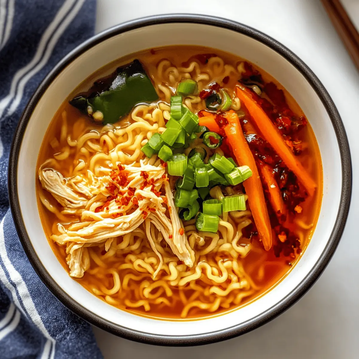 Jump to Recipe Print RecipeAs I stood over my steaming pot, the rich aroma of sautéed garlic and ginger wafted through the kitchen, instantly transforming my space into a cozy haven. This Tasty Ramen Noodle Soup embraces the essence of comfort food, providing warmth and nourishment, especially during those chilly evenings. What I love about this recipe is how quick it is to whip up—perfect for busy weeknights—and it’s incredibly versatile. Whether you’re a vegetarian, a health-conscious eater seeking gluten-free alternatives, or craving a traditional chicken version, this soup meets everyone’s palate. Each bowl is a delightful dance of tender noodles, vibrant veggies, and savory broth, promising a satisfying experience that wraps around you like your favorite blanket. Are you ready to dive into a comforting bowl of homemade goodness? Why is this Ramen Noodle Soup Special? Quick and Easy: This recipe comes together in less than 30 minutes, making it ideal for those busy weeknights. Versatile Options: From traditional chicken to hearty vegetarian and vegan variations, there’s something for everyone. Try swapping out chicken for extra firm tofu or tempeh for a satisfying meat-free meal. Flavor Explosion: With aromatic garlic and ginger, plus a splash of soy sauce, each spoonful bursts with deliciousness, transporting you straight to comfort food heaven. Customizable Ingredients: Add your favorite vegetables or substitute noodles to meet your dietary needs. Whether you prefer rice noodles or zucchini noodles, this soup caters to all cravings. Cozy Experience: The warm, rich broth envelops tender noodles and vibrant veggies, creating a heartwarming dish that feels like a hug in a bowl. Perfect with a squeeze of lime for that refreshing twist! Tasty Ramen Noodle Soup Ingredients For the Soup Base Oil – Enhances flavor and helps sauté vegetables; try olive oil or sesame oil for a nutty touch. Broth – The heart of your soup; use chicken broth for a rich taste or vegetable broth for a wholesome vegan option. Soy Sauce – Adds umami depth; switch to coconut aminos for a gluten-free alternative. For the Veggies Carrot – Provides sweetness and color; fresh carrots are best, but other root veggies like parsnip can be used. Bell Pepper – Brings texture and brightness; any variety works well, or substitute with zucchini for a gentler flavor. Onion – Offers essential sweetness and depth; both white and green parts are great, but always opt for fresh. Garlic – Gives a punch of aromatic flavor; fresh cloves shine, though garlic powder can save the day in a pinch. Ginger – Adds a zingy spice; fresh ginger is preferred, but ground ginger is a viable substitute if needed. Chili Flakes – Adds just the right kick; adjust to your spice tolerance or skip for a milder dish. For the Protein Chicken Breasts – A hearty addition to your soup; feel free to replace with extra firm tofu or tempeh for a vegetarian version. For the Noodles Ramen Noodles – The main component that makes this soup a hit; easy to sub with rice noodles for gluten-free or zucchini noodles for a low-carb twist. For Garnishing Green Onions – Use both white and green parts for extra flavor; chopped fresh is a must to finish your bowl. Step‑by‑Step Instructions for Tasty Ramen Noodle Soup Step 1: Heat the Oil In a large pot, heat 2 tablespoons of olive oil or sesame oil over medium-high heat. You’ll know it’s ready when the oil shimmers slightly. This step enhances the flavor of your Tasty Ramen Noodle Soup by creating a perfect base for sautéing your vegetables. Step 2: Sauté the Vegetables Add 1 diced carrot, 1 diced bell pepper, 2 minced garlic cloves, 1 tablespoon of grated ginger, and a pinch of chili flakes to the pot. Sauté these ingredients for about 3 minutes until they are softened and fragrant. Stir occasionally to prevent sticking, and savor the delicious aroma filling your kitchen. Step 3: Add the Broth and Chicken Pour in 6 cups of chicken or vegetable broth, then place 2 chicken breasts into the pot. Season with salt to taste. Bring the mixture to a gentle simmer over medium heat, cover the pot, and reduce the heat to low. Allow it to cook for 10-15 minutes, or until the chicken is fully cooked and tender. Step 4: Shred the Chicken Once the chicken is cooked, carefully remove it from the pot and place it on a cutting board. Using two forks, shred the chicken into bite-size pieces, then return the shredded chicken to the pot. This adds heartiness to your soup, enhancing the overall flavor of your Tasty Ramen Noodle Soup. Step 5: Cook the Ramen Noodles Add 4 ounces of ramen noodles directly into the pot with the soup base. Cook for about 3 minutes, stirring occasionally to ensure the noodles don’t stick together. You want them to be al dente, tender yet with a slight bite, soaking up the savory broth beautifully. Step 6: Final Flavors Mix in 1/4 cup of chopped green onions and 3 tablespoons of soy sauce, adjusting the amount to your taste. If you enjoy a bit more heat, sprinkle in some chili crunch or additional chili flakes at this point. Give the soup a gentle stir to blend all the flavors together evenly. Step 7: Serve and Enjoy Ladle the steaming Tasty Ramen Noodle Soup into bowls, garnishing with extra chopped green onions if desired. The vibrant colors and rich broth create an inviting presentation. Serve hot, and feel free to add a slice of lime for a splash of brightness that elevates this cozy dish. How to Store and Freeze Tasty Ramen Noodle Soup Fridge: Store any leftover Tasty Ramen Noodle Soup in an airtight container for up to 3 days to maintain freshness and flavor. Separate Components: For best results, keep the noodles separate from the broth if possible, as they may become overly soft when stored together. Freezer: Freeze the soup base without the noodles in a freezer-safe container for up to 3 months. When ready to enjoy, thaw in the fridge overnight and reheat on the 