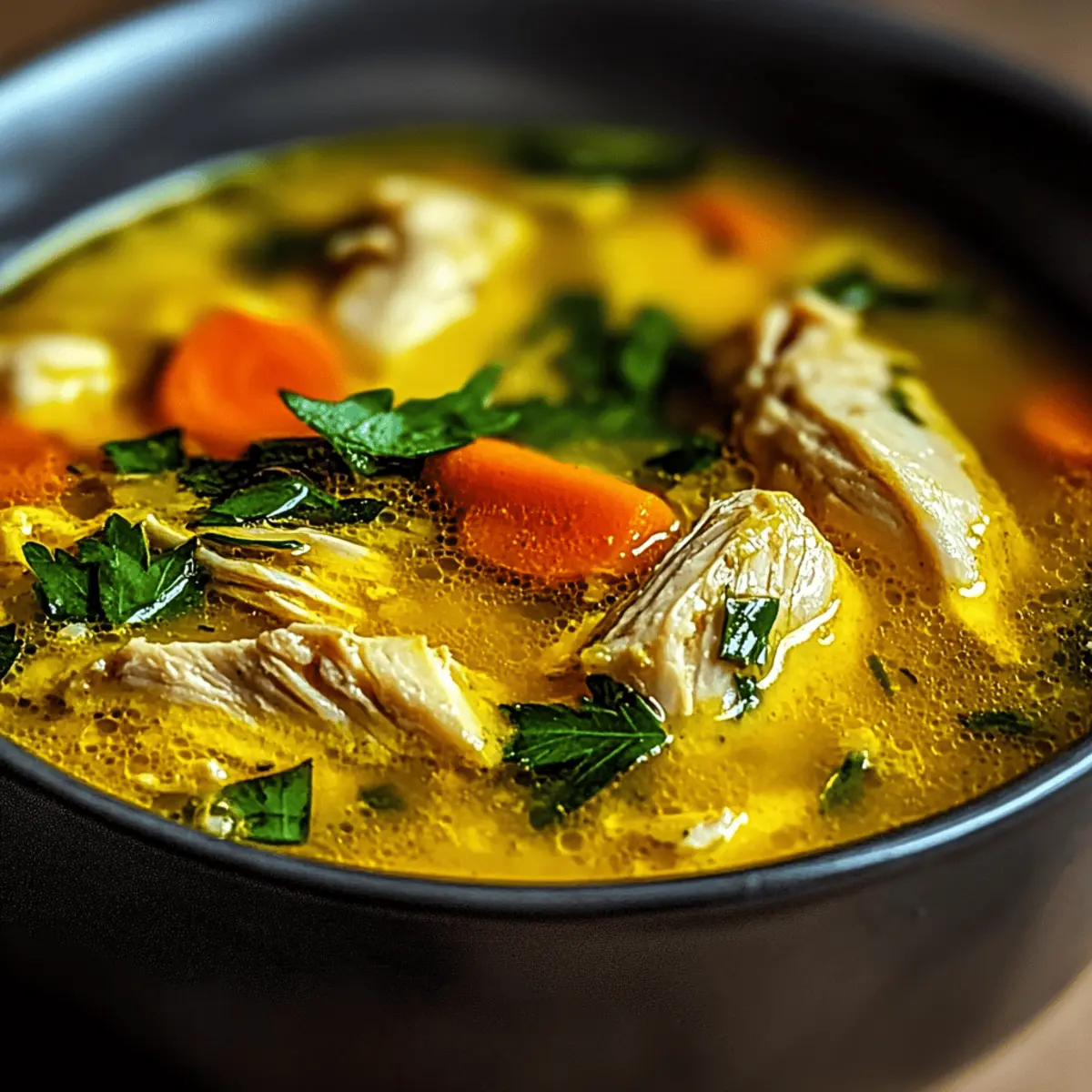 Jump to Recipe Print RecipeThe aroma of spices dancing in the kitchen is a sure sign that comfort is on the way, and nothing brings that warmth quite like my Healing Anti-Inflammatory Turmeric Chicken Soup. Packed with tender chicken, fresh vegetables, and a golden broth enriched with turmeric, this soup isn’t just a feast for the senses; it’s a powerful ally in boosting your immune system and fighting inflammation. In just one pot, you’ll create a meal that’s not only gluten-free and nourishing but also quick to prepare—perfect for those busy weeknights! As each spoonful wraps around you like a cozy hug, you’ll be surprised at how simple ingredients can deliver such incredible health benefits. Ready to discover the secret to a heartwarming dish that’s as kind to your body as it is to your taste buds? Let’s dive in! Why Is Turmeric Chicken So Special? Comforting, this Healing Anti-Inflammatory Turmeric Chicken Soup embraces you with each spoonful, making it an ideal remedy for chilly evenings. Nutrient-packed, featuring vibrant vegetables and powerhouses like turmeric and ginger, it supports your immune health beautifully. Quick to make, this recipe saves time while delivering satisfying flavors, perfect for busy cooks. Versatile, feel free to adapt with different greens or add your favorite noodles, making it eternally appealing. Plus, it pairs wonderfully with a slice of crusty breador a light salad, rounding out your meal perfectly! Turmeric Chicken Soup Ingredients For the Soup Chicken Breast – Main protein source that adds richness and flavor to the broth. Substitution: Can use frozen chicken, but ensure thorough cooking. Turmeric – Provides anti-inflammatory benefits and the soup’s golden color. Note: Essential for the recipe; alternative could be curry powder for flavor but not health benefits. Ginger – Fresh ginger adds a zesty kick with digestive benefits. Substitution: Ground ginger may be used but fresh is ideal for flavor. Garlic – Enhances flavor and supports the immune system. Note: Use fresh for best results; avoid garlic powder to maintain texture. Carrots – Adds sweetness and color, rich in vitamins A and C. Substitution: Other root vegetables like parsnips may work. Celery – Contributes crunch and freshness, balancing the spices. Note: Can be omitted if unavailable. Onion – Provides depth to the flavor profile. Substitution: Shallots can be used for a milder flavor. Low-Sodium Chicken Broth – Base for the soup, infuses flavor. Substitution: Bone broth can be used for added nutrients. Coconut Milk – Adds creaminess and a hint of sweetness. Substitution: Regular milk or dairy-free alternatives can work. Lemon Juice – Brightens flavors and balances richness. Note: Fresh juice preferred; bottled may alter taste. Spinach – Provides leafy greens and boosts nutrients. Substitution: Kale or Swiss chard can also be used. Step‑by‑Step Instructions for Healing Anti-Inflammatory Turmeric Chicken Soup Step 1: Sauté the Aromatics In a large pot, heat 2 tablespoons of olive oil over medium heat. Add diced onion, carrots, and celery, sautéing for 5–7 minutes until they soften and become fragrant. The onions should become translucent and the vegetables lightly caramelized, creating a flavorful base for your Turmeric Chicken Soup. Step 2: Brown the Chicken Introduce the chicken breasts to the pot and cook for about 5 minutes, turning occasionally, until they are slightly browned on all sides. This step helps to develop a rich flavor in the broth. You’ll know it’s time to move on when the chicken has a nice golden hue and is no longer pink. Step 3: Add the Spices Stir in the minced garlic, freshly grated ginger, and turmeric, cooking for an additional 1–2 minutes until the mixture becomes fragrant. The vibrant yellow color from the turmeric will brighten the dish, and the aroma will fill your kitchen, signaling that the spices are properly sautéed. Step 4: Create the Broth Pour in the low-sodium chicken broth and coconut milk, stirring well to combine. Bring the mixture to a gentle simmer over medium-high heat. Once it reaches a simmer, reduce the heat, cover the pot, and let it cook for 15–20 minutes until the chicken is thoroughly cooked and tender. Step 5: Shred the Chicken After the chicken is fully cooked, carefully remove it from the pot and place it on a cutting board. Use two forks to shred the chicken into bite-sized pieces, then return the shredded chicken to the pot. This will ensure every spoonful of the Turmeric Chicken Soup is loaded with tender meat. Step 6: Add the Greens Toss in the fresh spinach and stir until it wilts, which should take about 2–3 minutes. This adds a beautiful pop of green and boosts the nutritional value of your soup. The simmering broth will brighten the spinach and help it maintain a vibrant color. Step 7: Finish and Adjust Squeeze fresh lemon juice into the soup and give it a good stir to balance the richness. Taste the broth and adjust seasoning with salt and pepper, if needed. The final flavor should be bright and comforting, embodying the warmth of your Healing Anti-Inflammatory Turmeric Chicken Soup. Step 8: Serve and Enjoy Ladle the hot soup into bowls, garnishing with fresh herbs if desired. Serve it warm alongside crusty whole-grain bread or a side salad for a wholesome meal. Each bowl is a heartwarming embrace, perfect for feeding your body and soul on a chilly day. Expert Tips for Turmeric Chicken Soup Use Fresh Ingredients: Fresh garlic and ginger elevate the flavor significantly compared to dried options, giving your turmeric chicken soup an authentic taste. Perfectly Shredded Chicken: For even distribution, let the cooked chicken rest briefly before shredding it into bite-sized pieces; this prevents it from becoming mushy. Enhance with Spice: For an added kick, incorporate red pepper flakes or a diced chili pepper when sautéing the aromatics, bringing an extra layer of flavor to